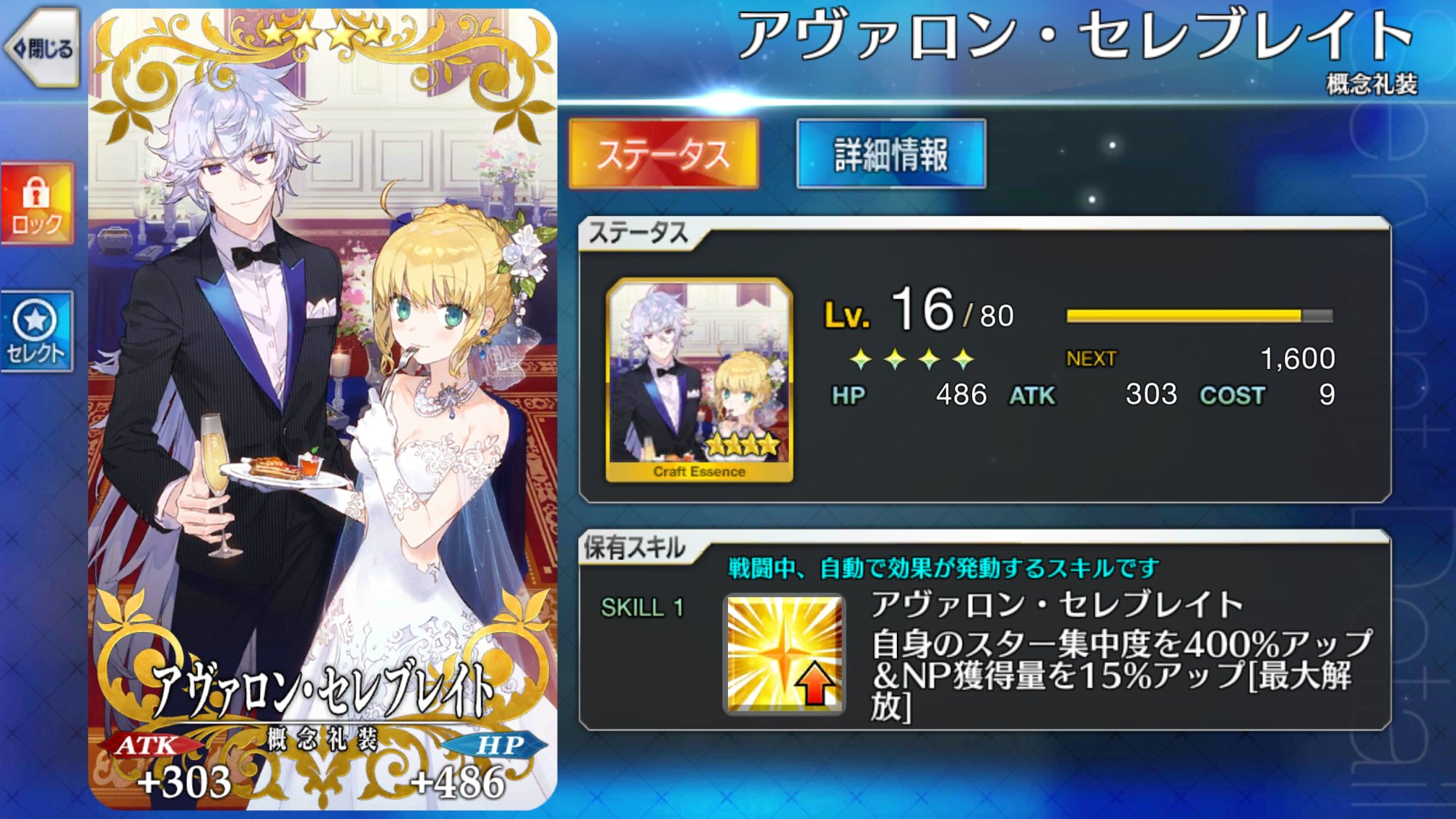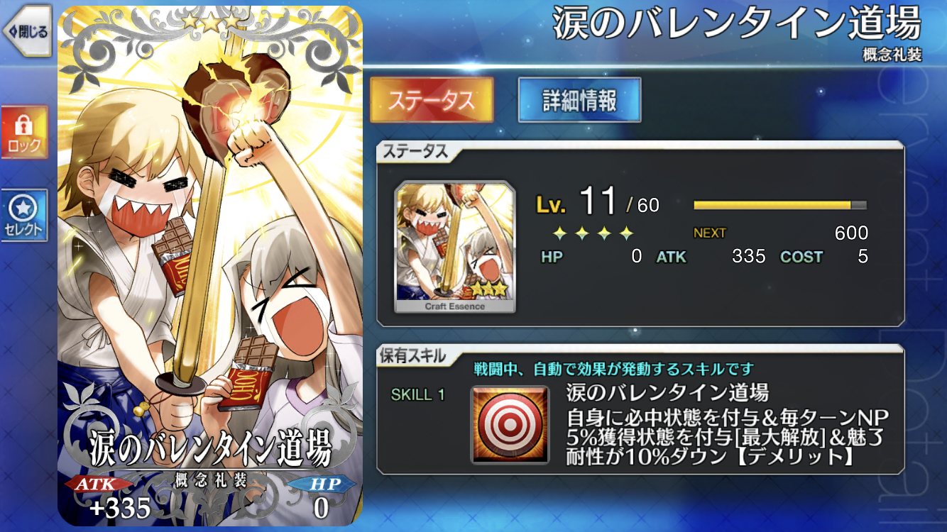 5コス、バスター20%アップ、防御ダウン、atk補正とコスト効果が高い。周回時バサカ素殴りで良い時に有用。後衛のコストに余裕が出るので絆に回せるチョコ・エンゼルがめっちゃ来て限凸したらなかなかいい礼装