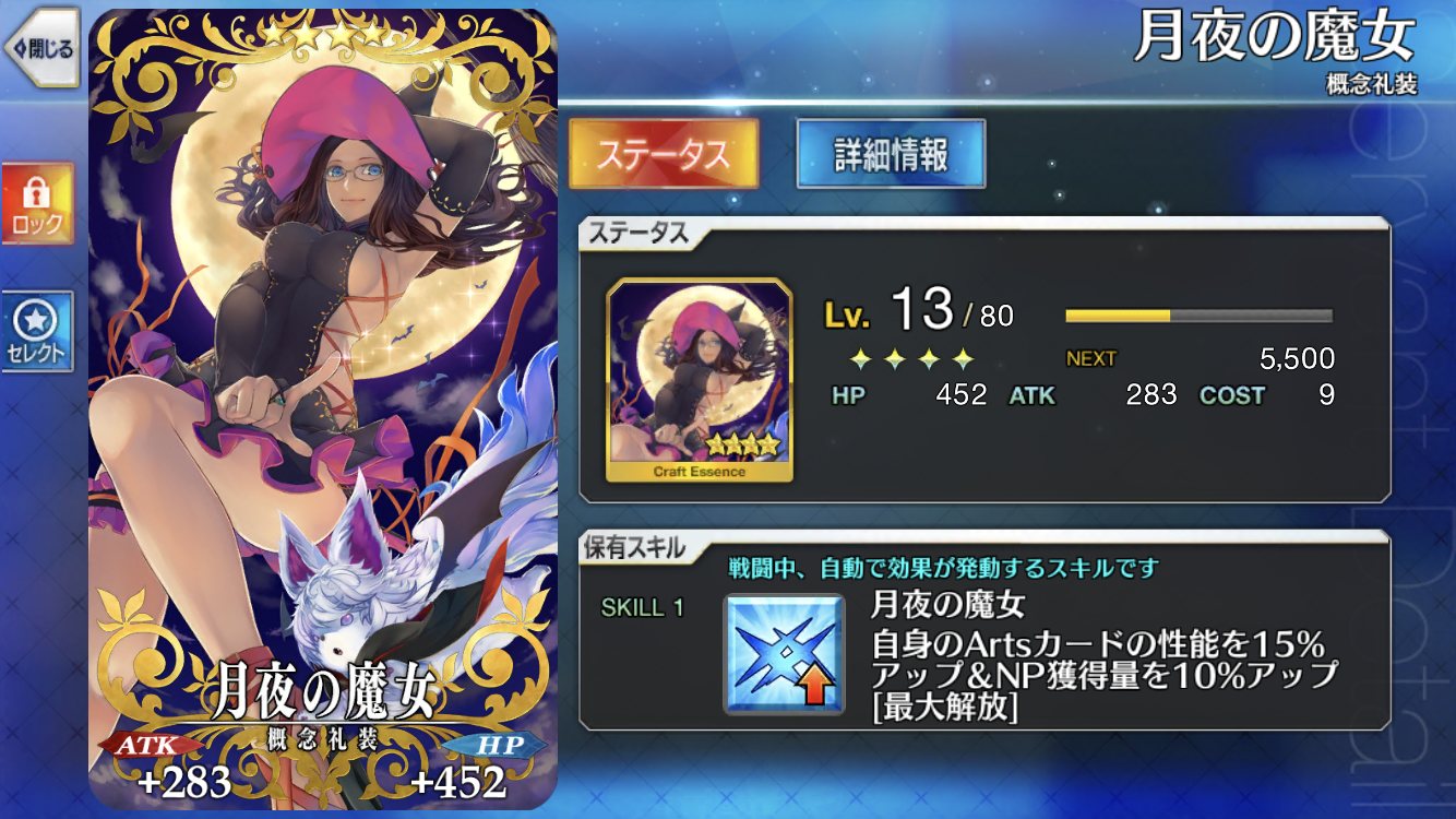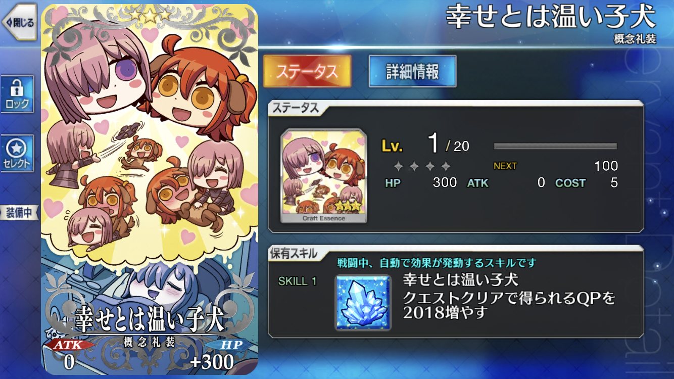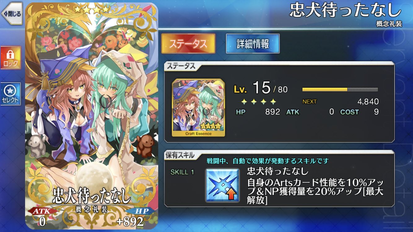 必中付与に加え、凸でバスター性能が10%上がるという隠れた有能。必中礼装の中でも取り回しの良さでは何気にトップクラスではなかろうか月夜の魔女、忠犬待ったなしはキャス狐に使ってる