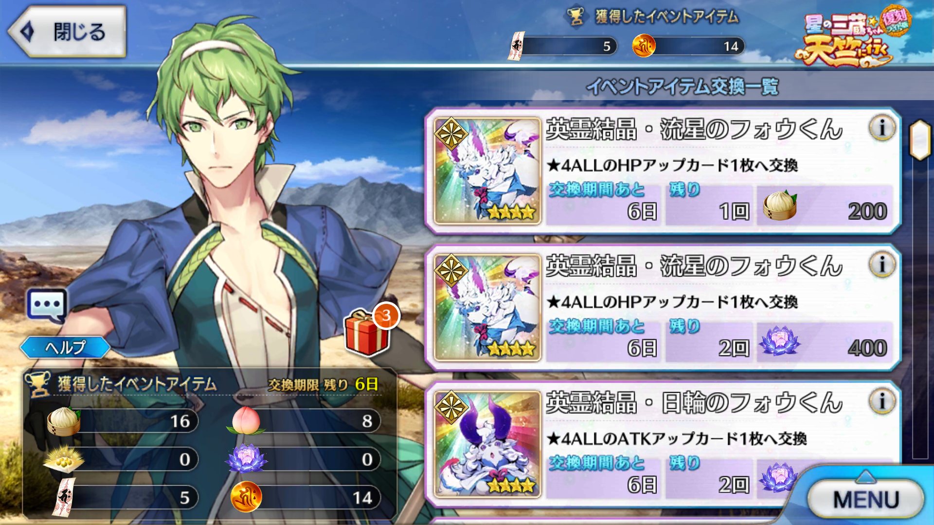 ということだろう。しかし、天竺イベ終わったらアポイベ始まるまで曜日クエスト消化しようと思ってたんだが、