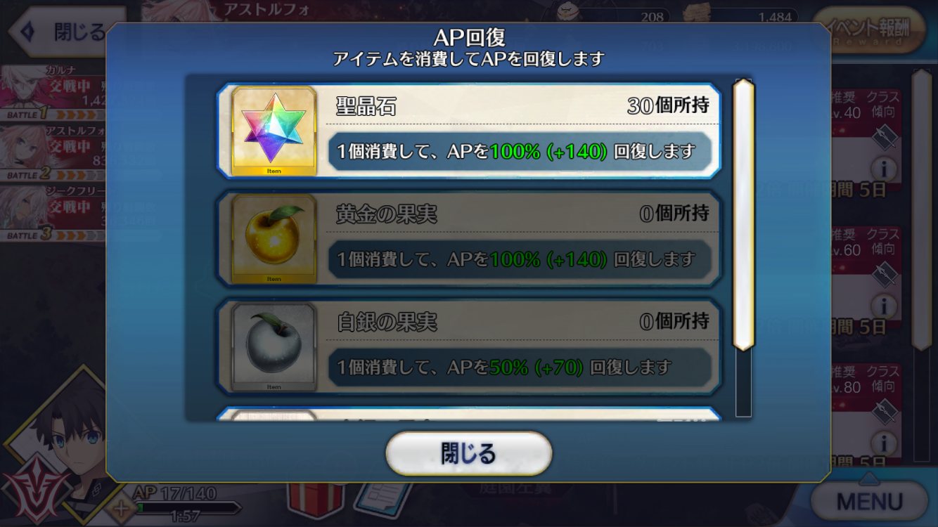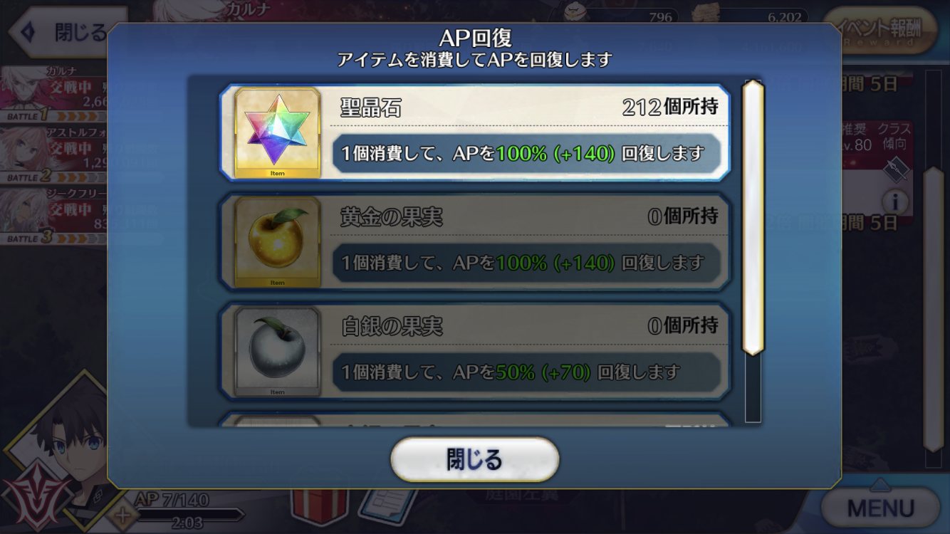 マナプリ100個で金林檎1個のレートなら、すぐさま林檎100個と交換するんだが他の2人も回りたいけど、ハサンたちが骨を要求しすぎてカルナさん狩りから抜けられない…何でみんなアホみたいな数を要求するんだ…