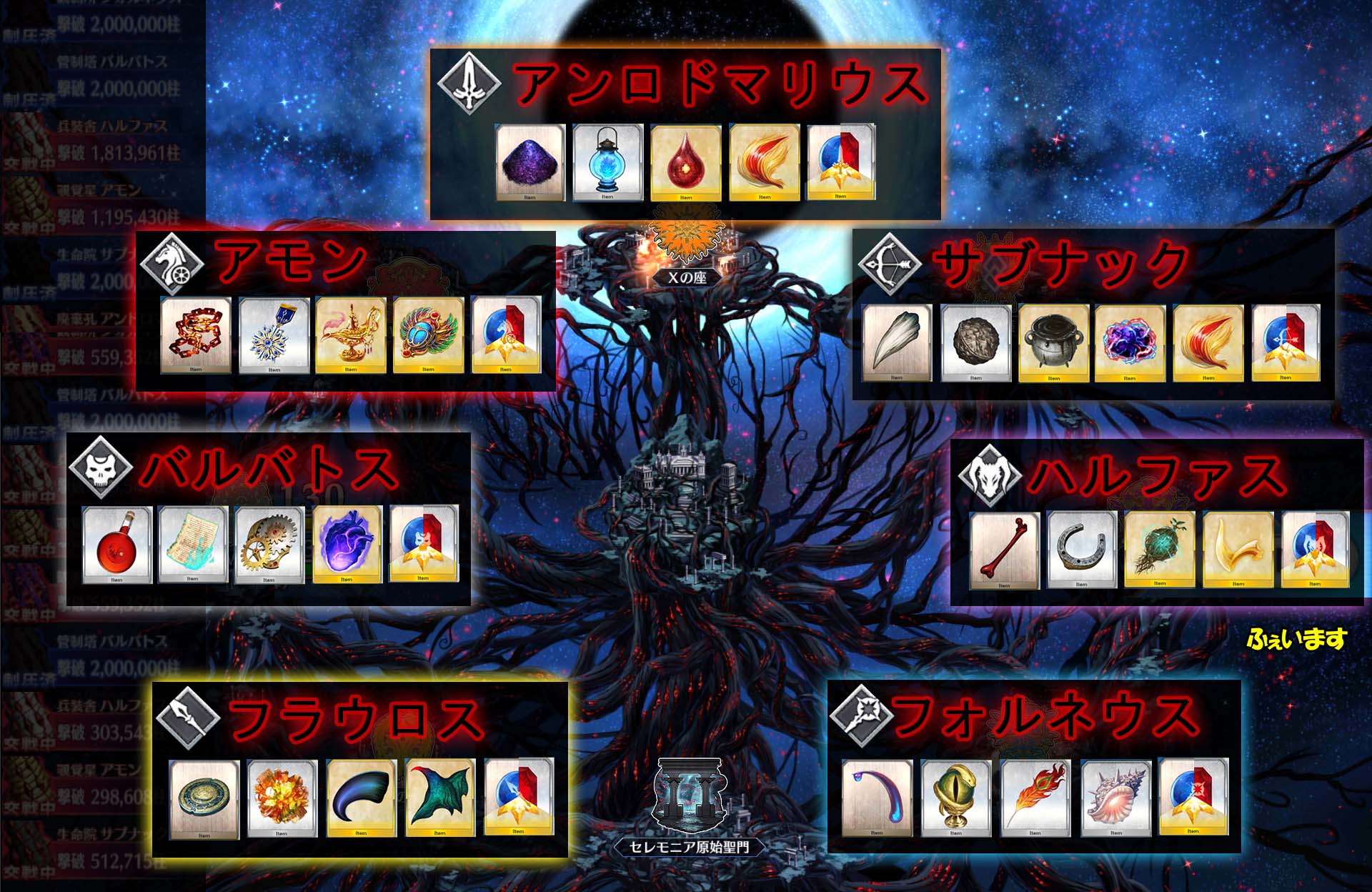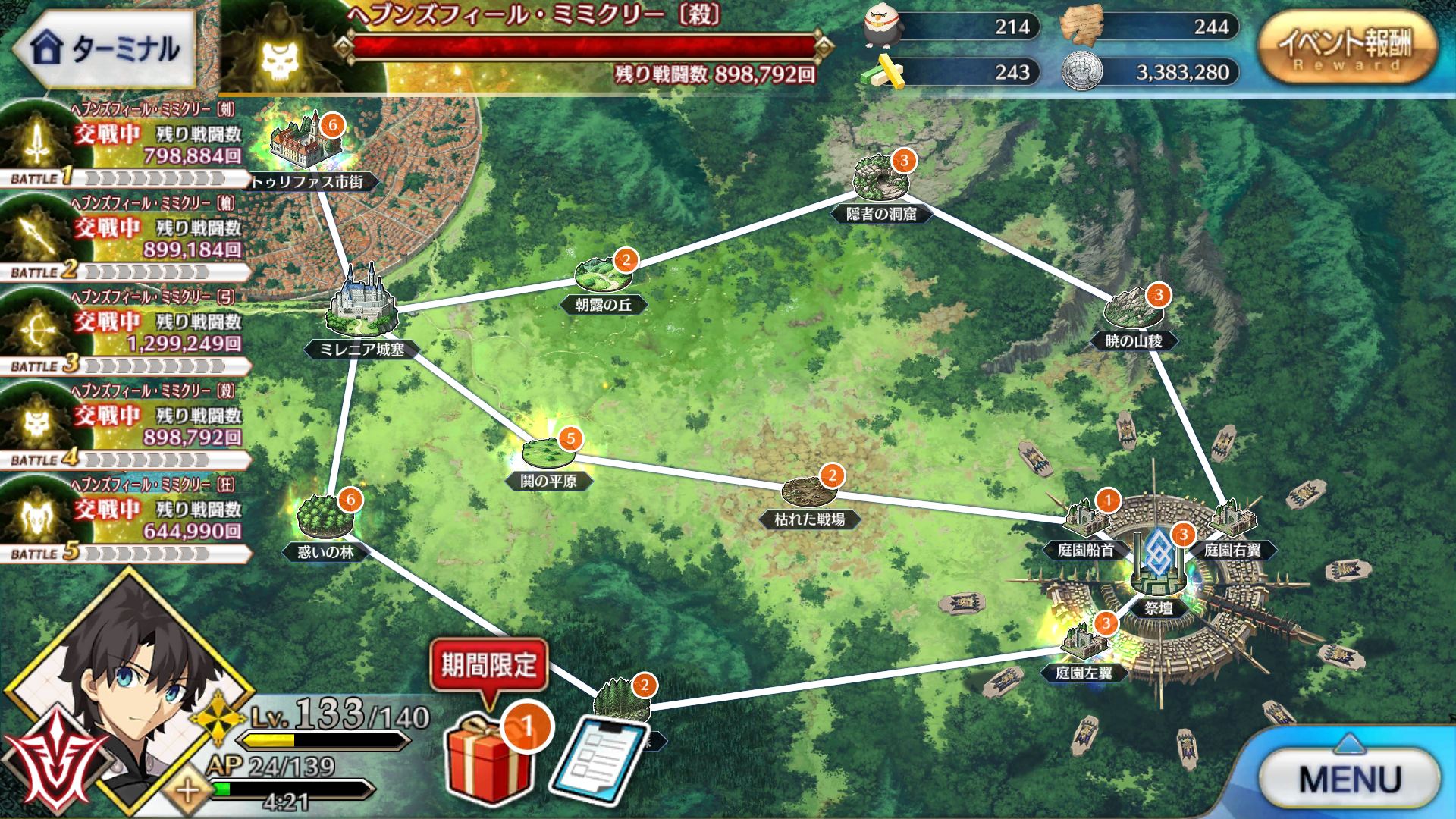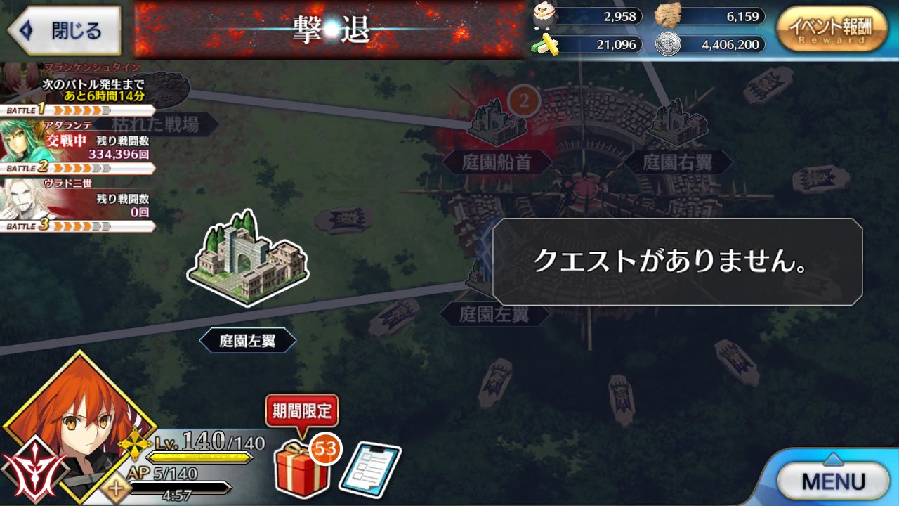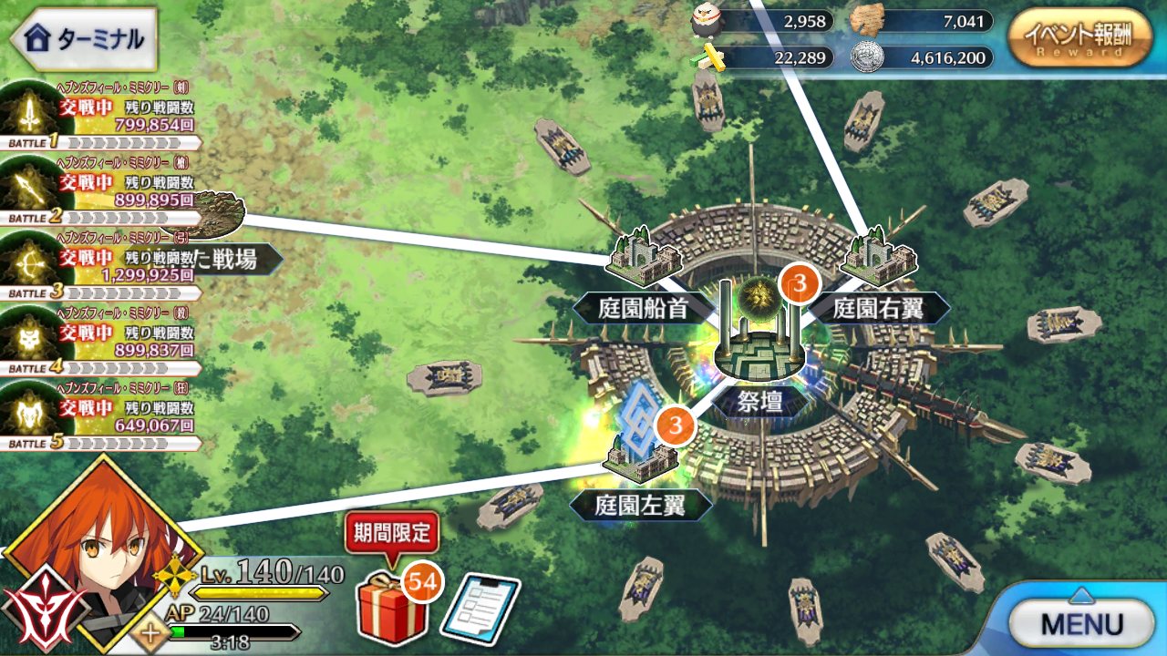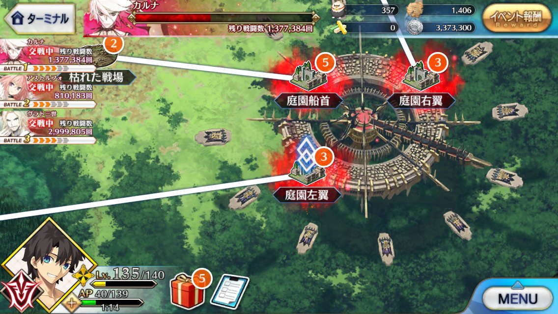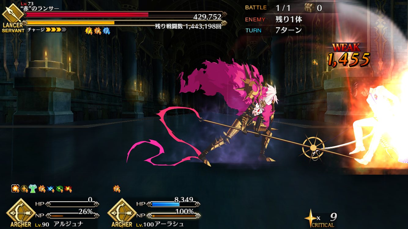 なおその情報を知る前に槍相手にベディで出陣してしまった模様狂のところはHPは40万ほどで高くない。戦闘開始時にフランちゃんHP27万ほどを召喚(スキル、黄金色の宿り木)。本体はダメージ受けるとクリティカルアップ効果持ち(スキル名は警告擬態)。