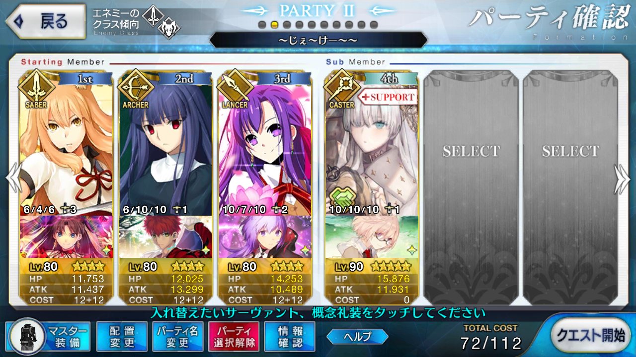 術ギルと組み合わせると対魔力持ち(天草とか)に対しても弱体付与がはじかれる可能性が低くなるうえアーツアップでさらに使い勝手ドンというね。水着マリーちゃん来たらギンカさん鯖でパーティ組めるようになるから来てほしい。妥協さんはほら星3っぽいからすぐいつかは引けそうだし……