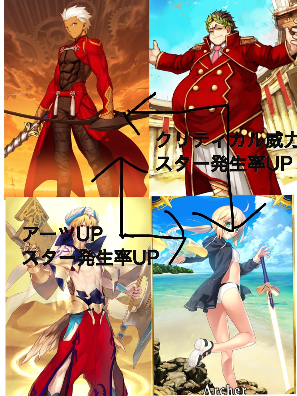 回数性ガッツ持ちで火力バフももってて、全体回復持ちのヒーラーで、星を吸いやすいライダーなんでスペック以上の火力も出せるし、宝具も運次第とはいえNPゲージダウン持ちだしですごく便利>>36