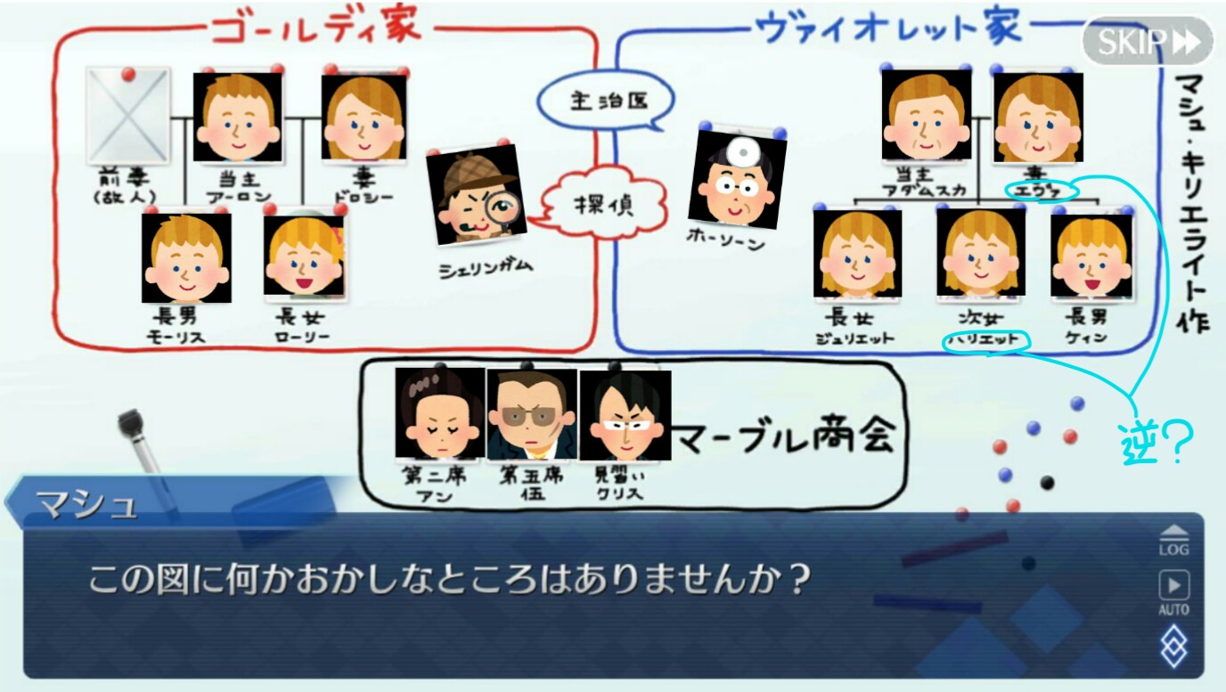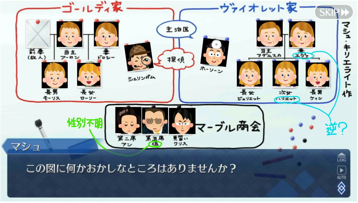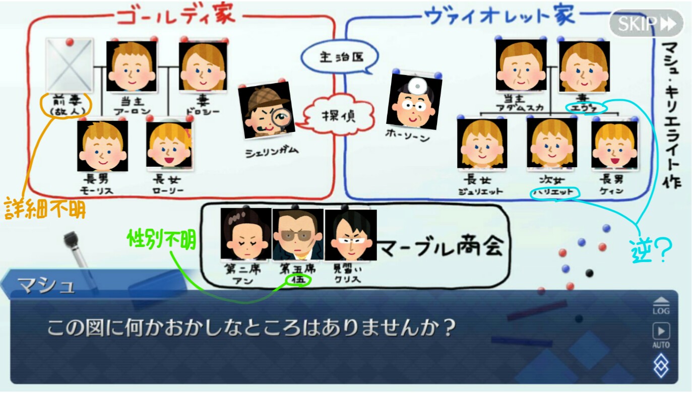 以上の理由から、ゴールディ家もヴァイオレット家も魔術師の家系で、ぐだの外の人は巻き込まれて記憶処理をされた一般人に思える。なお一番分からないのはシェリンガム。一体何者やねん。