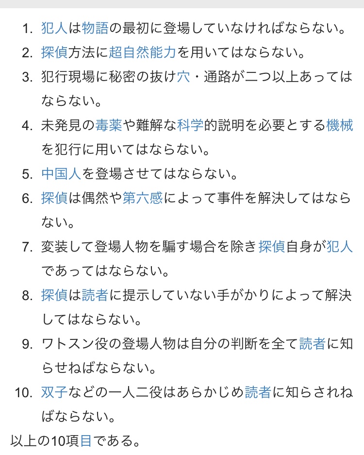 なお、これを意図的に破った作品があるほか、ノックス氏自身がこのルールを破った作品もあったりするので参考程度にセイレムを思い出すなあ...つまりいつかここもコラ祭り会場に変わる...?