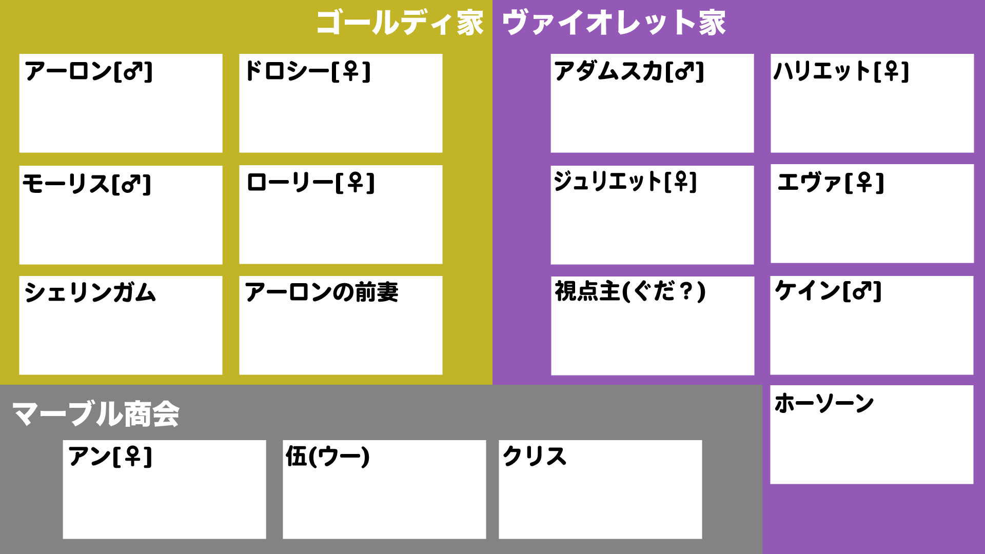 ・ゴールド家の次期当主であるモーリス(モードレッド)は、現当主アーロン(フィン)の実の息子ではなく、アーロンの前妻(すでに故人)もしくは後妻ドロシー(マリー)とヴァイオレット家当主のアダムスカ(ランスロット)との間の不倫の子であり、つまりはゴールド家当主の血は引かず、逆にヴァイオレット家当主の血を引く。むしろヴァイオレット家のジュリエット(ステンノ)らの異母兄弟にあたる。