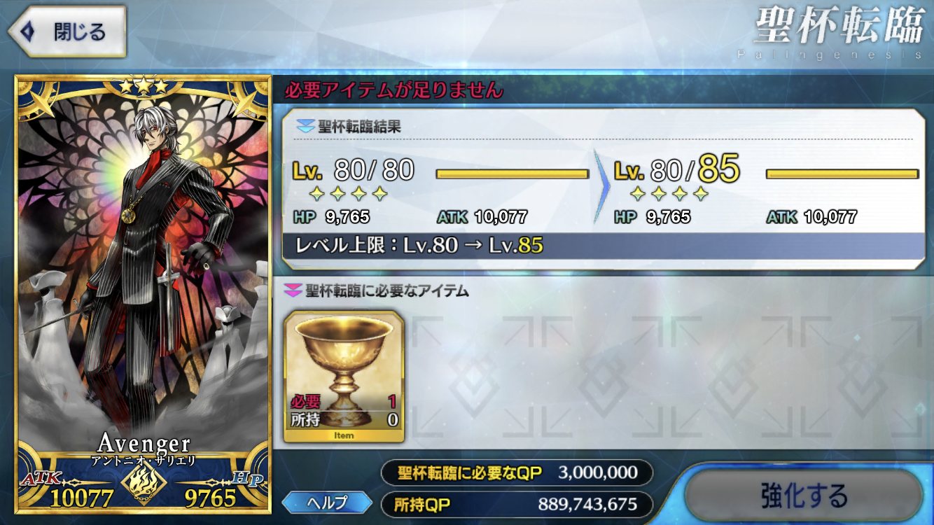 サリエリのレベル100いいな!俺もスキルMAXレベル100にしたいよ。だけど聖杯が足りない……足りないんだ!