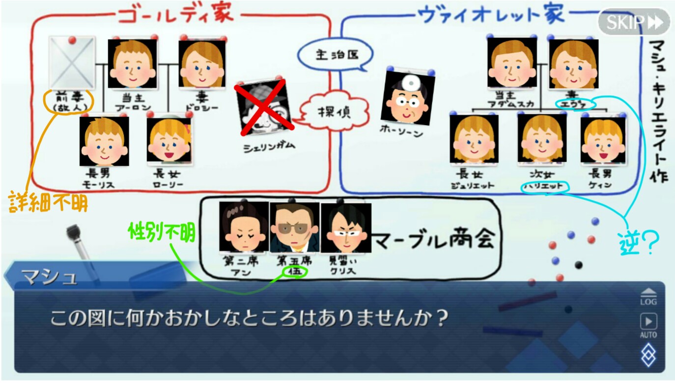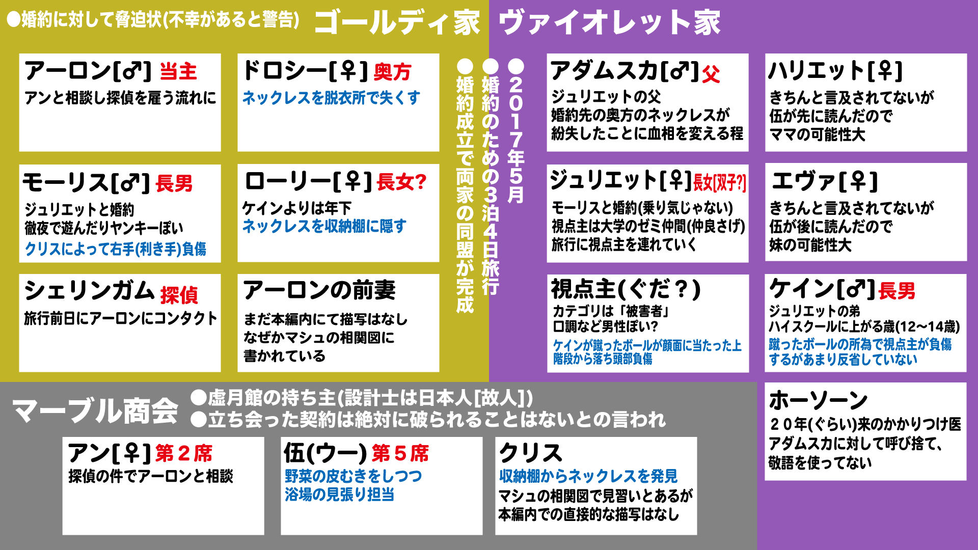 少なくとも自分なら絶対そうするわマシュ作の登場人物の関係表、金家の前妻もライターのミスリードではないかな?と思う