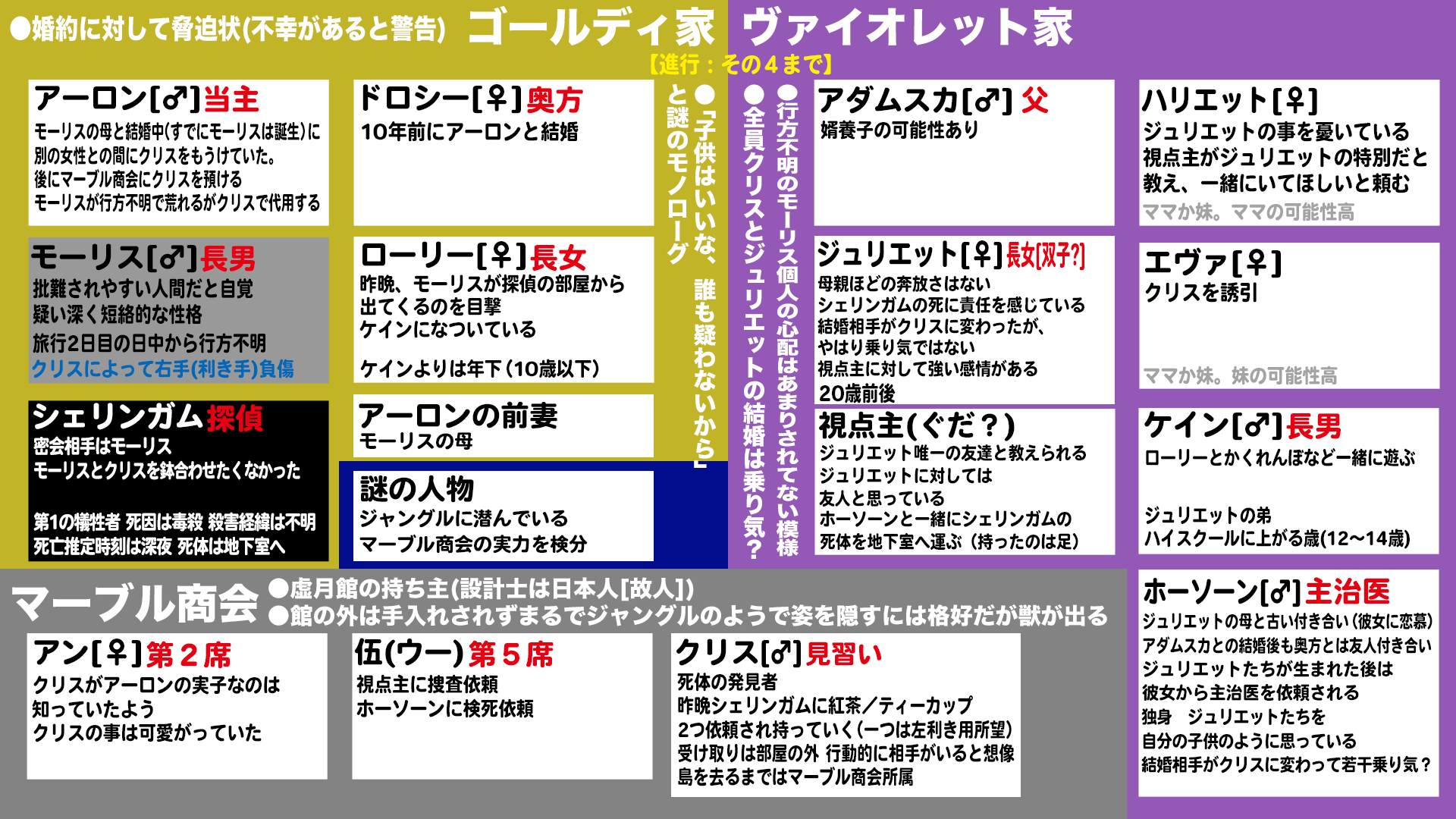 ガワの人に入ったぐだの先入観、第一印象で無意識に処理した結果ああなってるんだから見た目は変わんねぇんじゃねぇかな今の所一番怪しいのはゴールディ家当主アーロン、二番手アーロンの妻ドロシー、三番手ヴァイオレット家長男ケインかな?