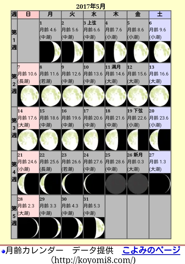 で、今回ジュリエットと夜の海岸で話してた時に満月が出てたけど、2017年5月の満月が出る日は11日