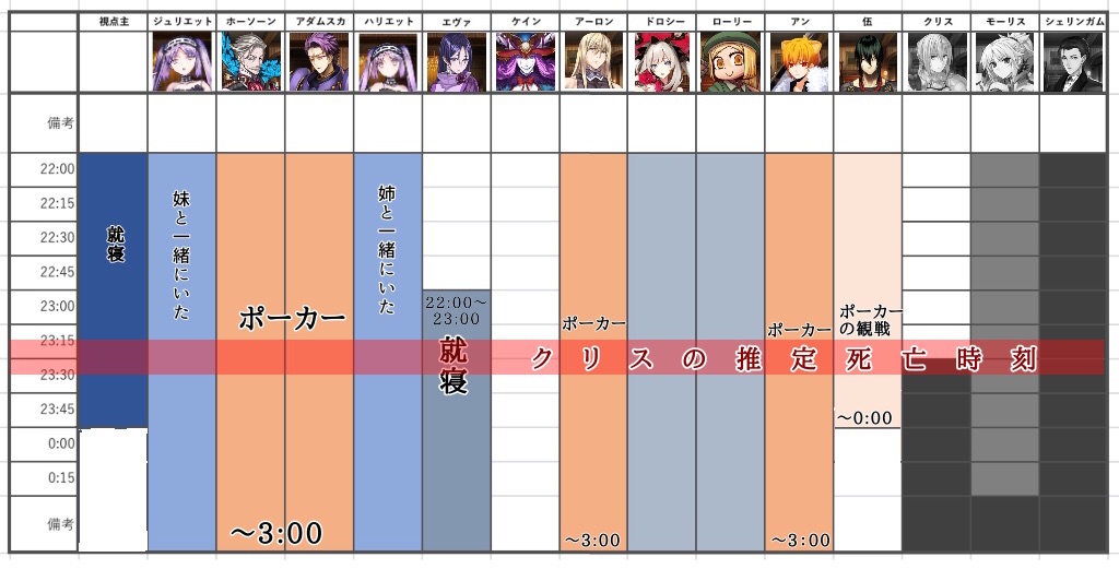 エヴァ(エウリュアレ)のアリバイはハリエット(頼光)のうろ覚えな午後10時~11時のみ。