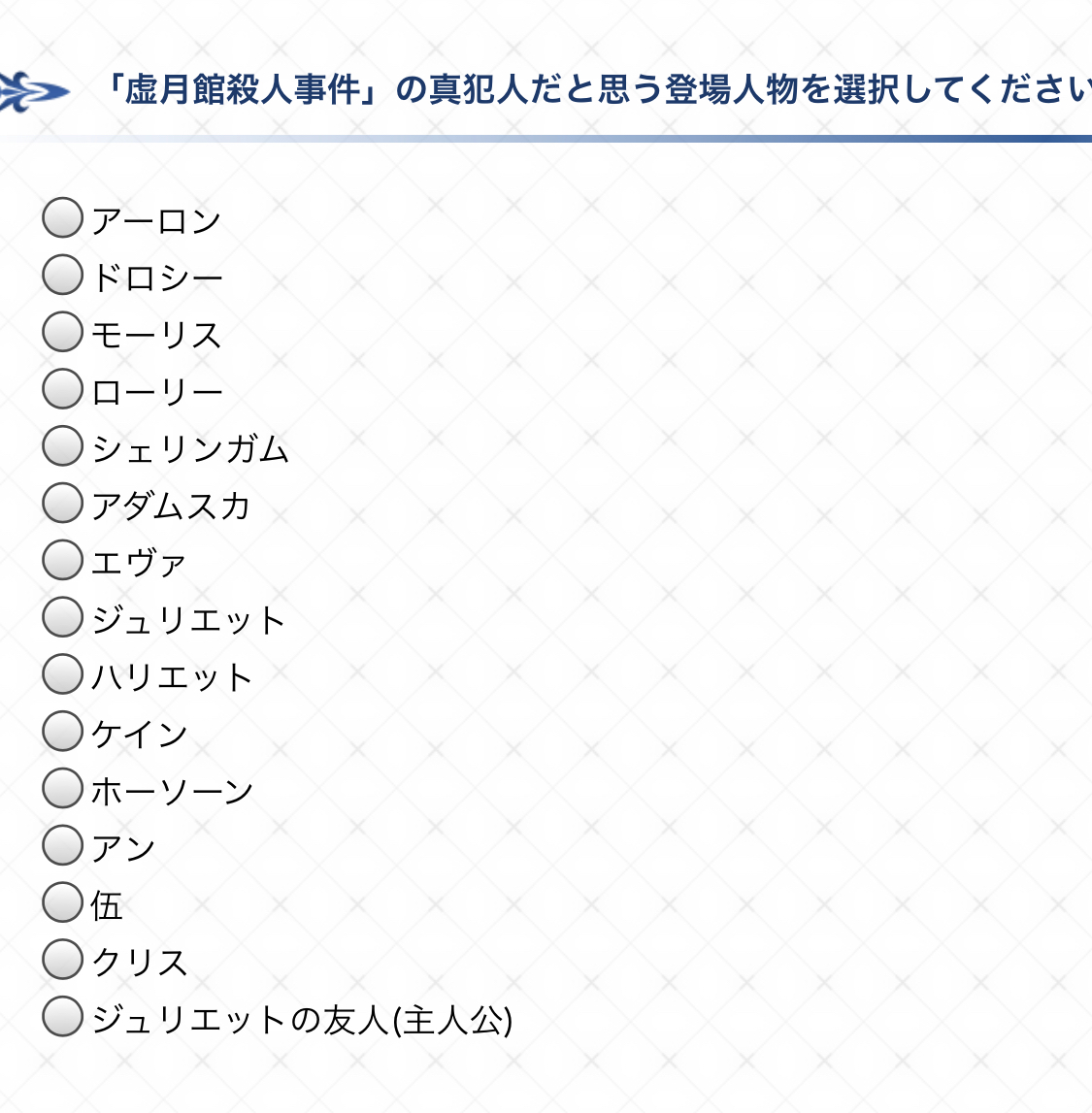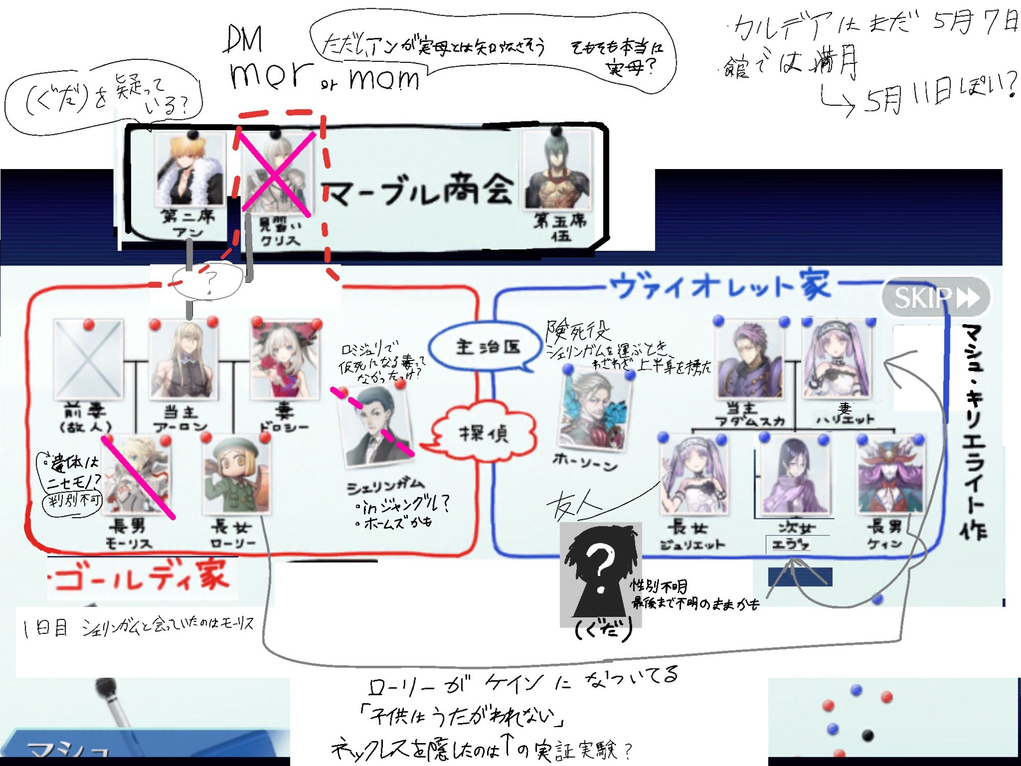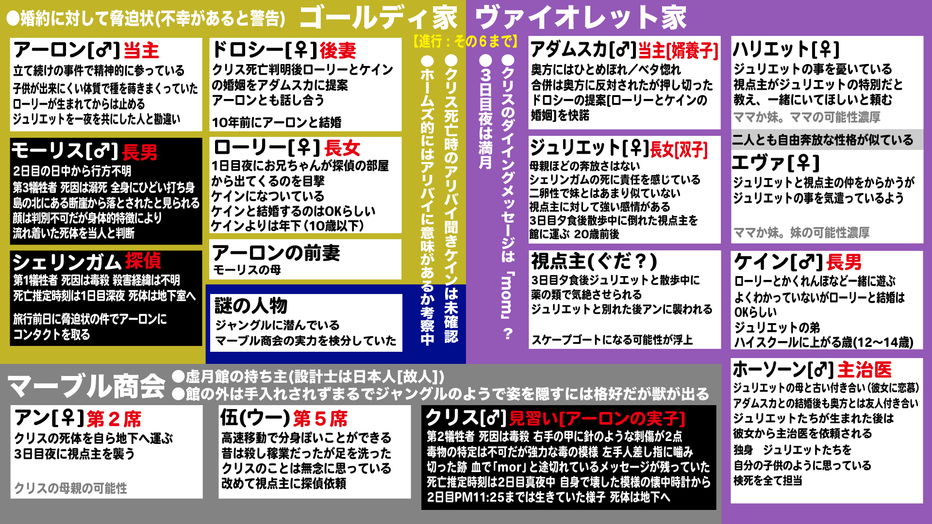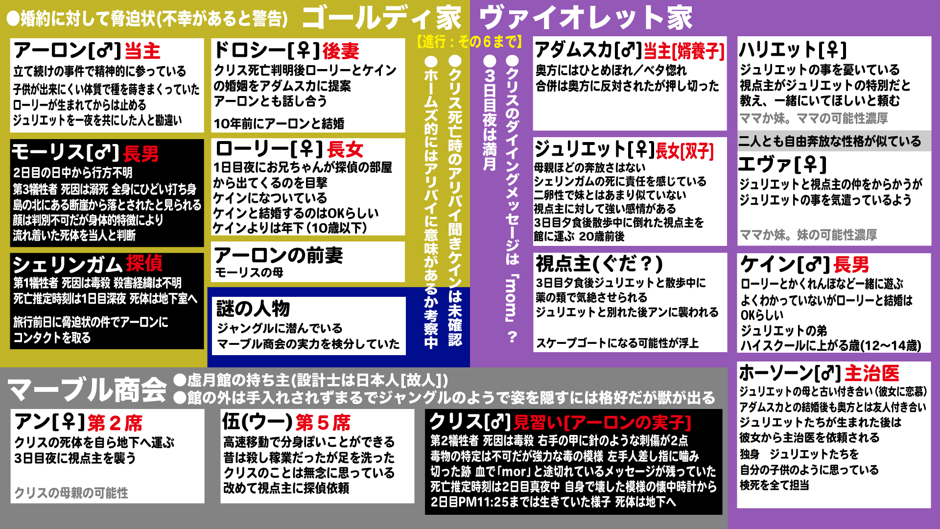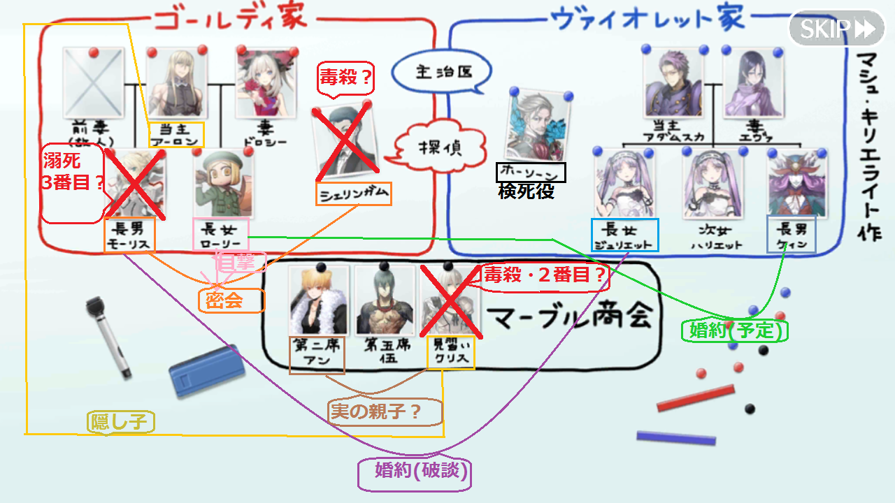 例えばモーリス、シェリンガムに持って行った紅茶に毒が仕込んであり、これをホームズが阻止、自身が飲んだように偽装し森に潜伏しながらモーリスの偽装工作を行い、クリスが別の犯人の手にかかることを静観していたのかもしれない犯人はハリエットだと思います。ダイイングメッセージはそのままmomで母←ただしアンではなく別の母親でドロシーは今の所結婚の反対意見を出してない、アダムスカの証言で妻が反対していると言っていた。エヴァは妻ではなく双子の妹でハリエットが奥さん。ネックレスが盗まれた時ウーさんの証言でハリエット、エヴァの順で名前をあげている奥さんの前に妹の名前を言うのは不自然だと思う。その時の立ち絵もゴールディ家の並びと合わせると真ん中に妻が来ている。後妄想ですけどジュリエット達はアーロンとの間にできた子供説を出しておきます。