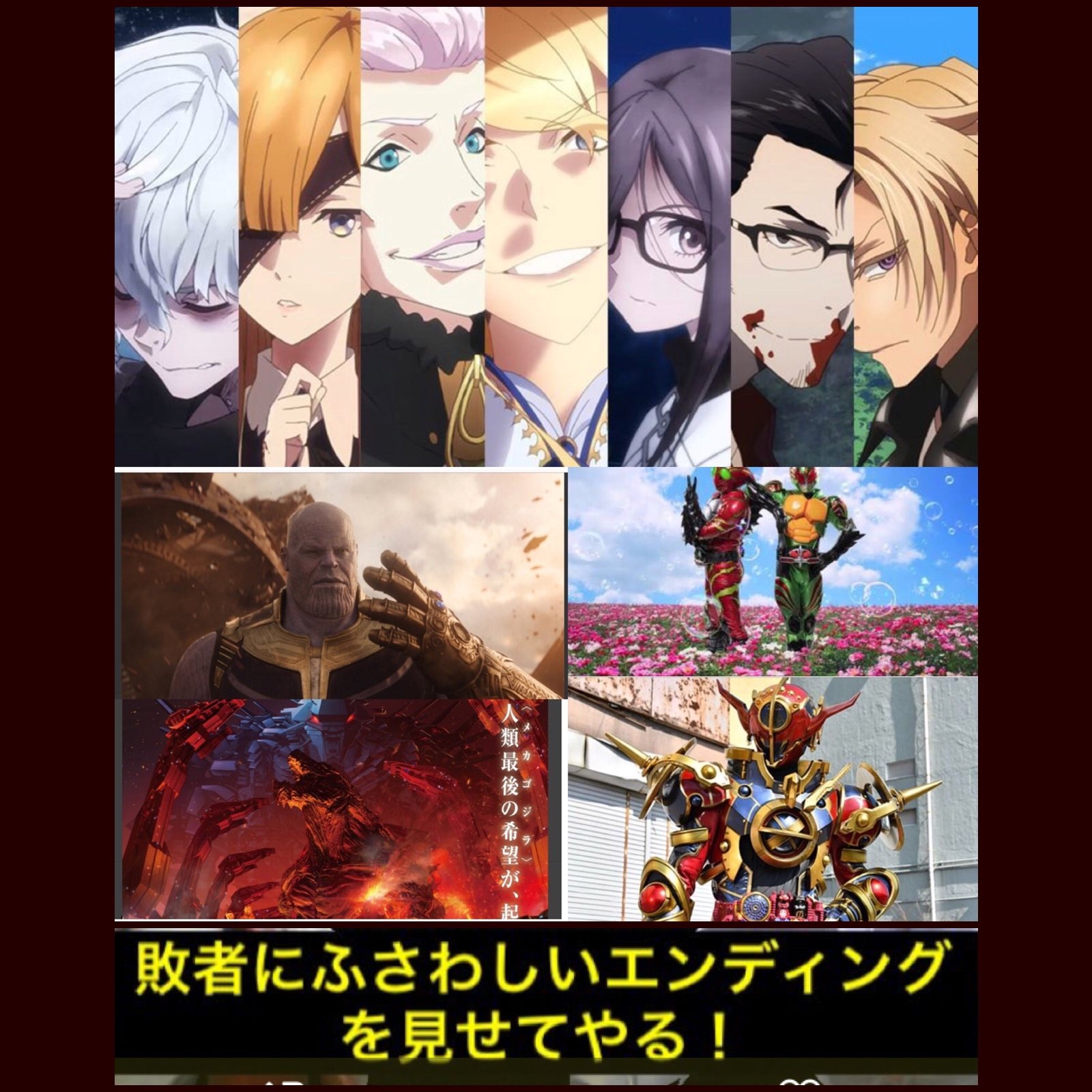 特撮的なお約束守らずに手段選ばないなら上の7人の内一人でも十分ムテキ相手に勝ち目あると思うぞ。サノスと違って絶対とは言えないがゴジラ・ランペイジ見終わったから夜にアマンゾンズ見に行くぜ