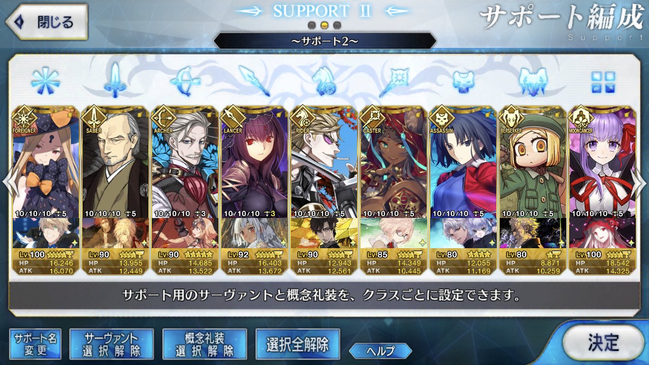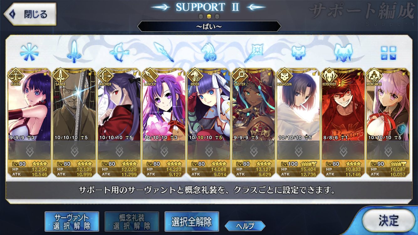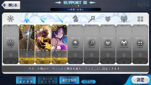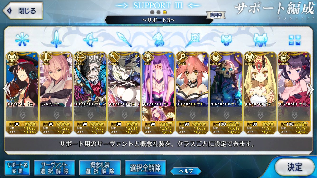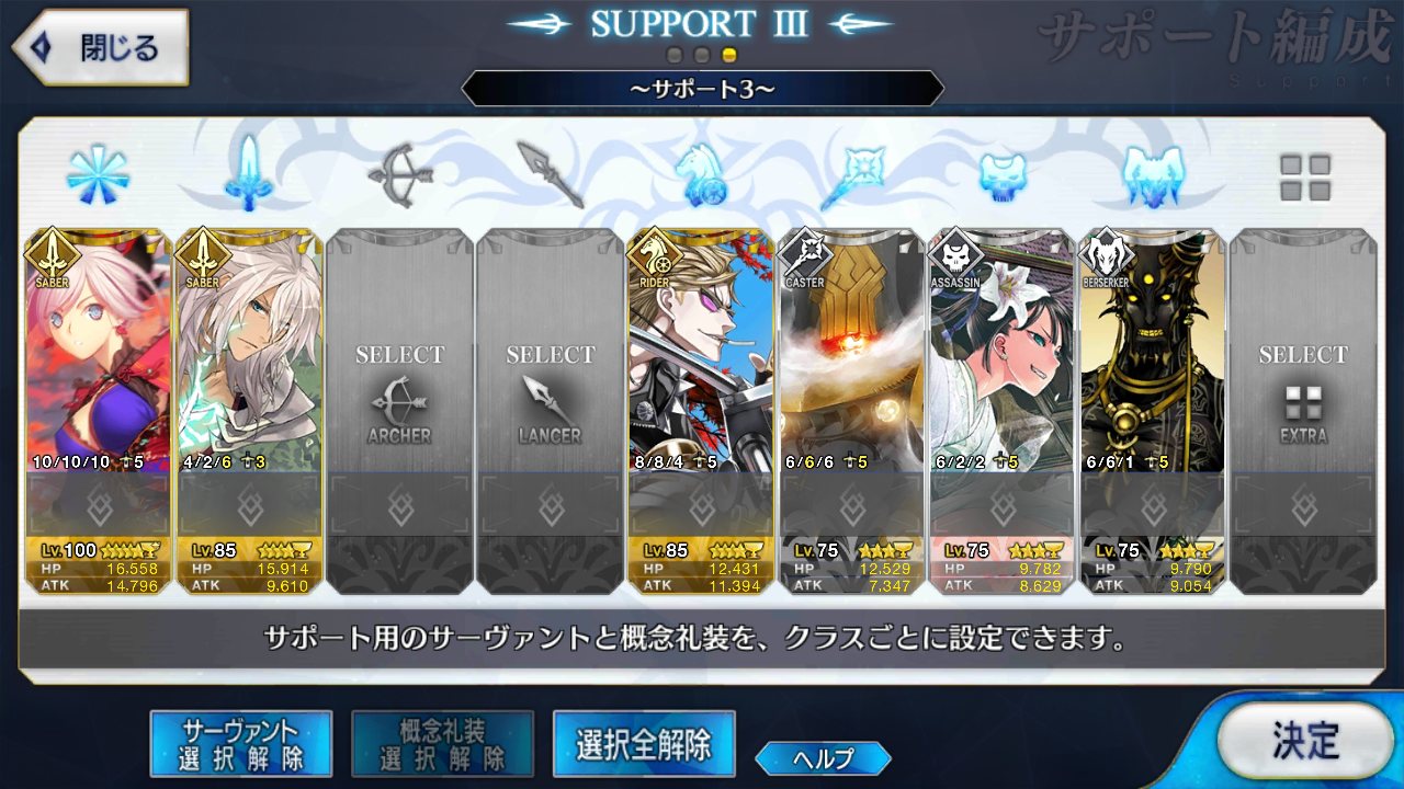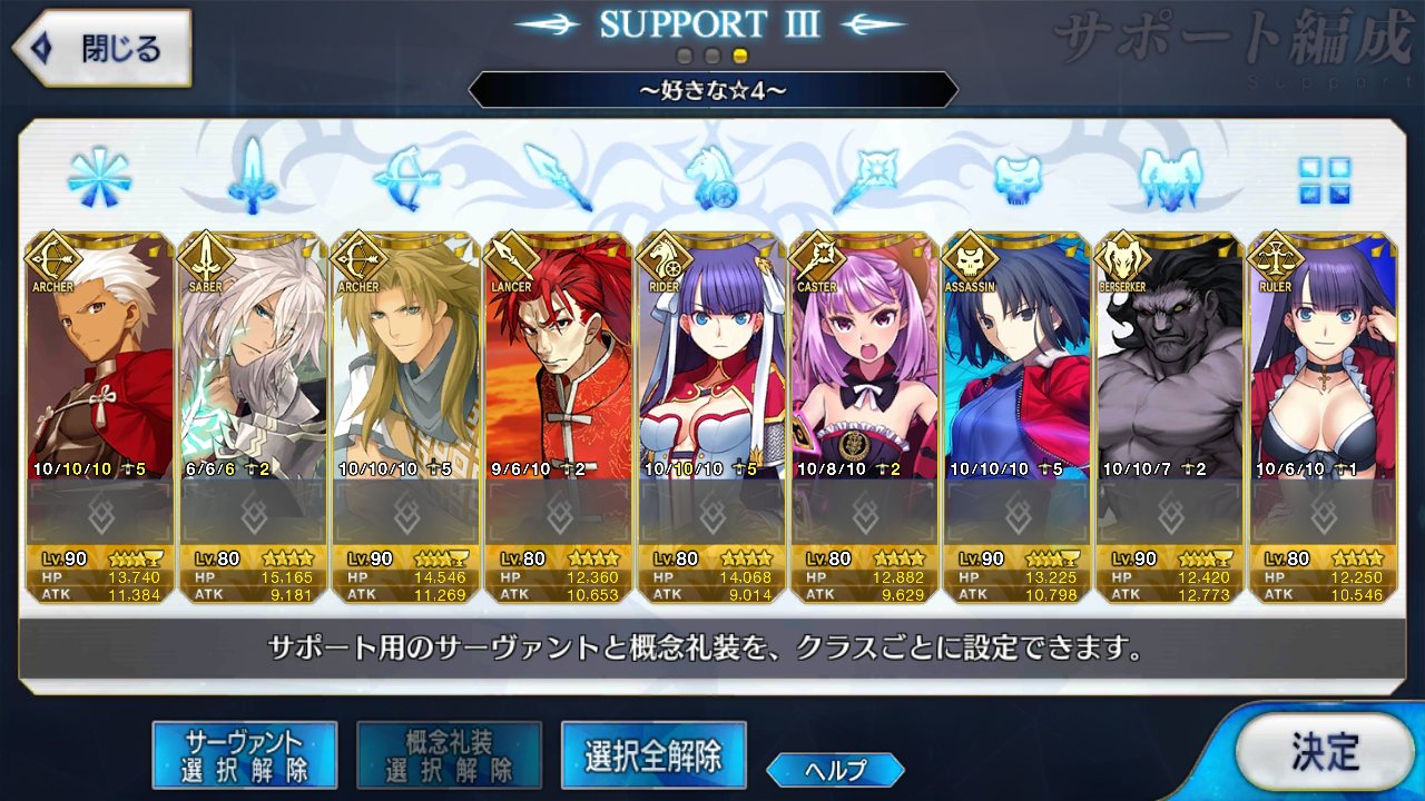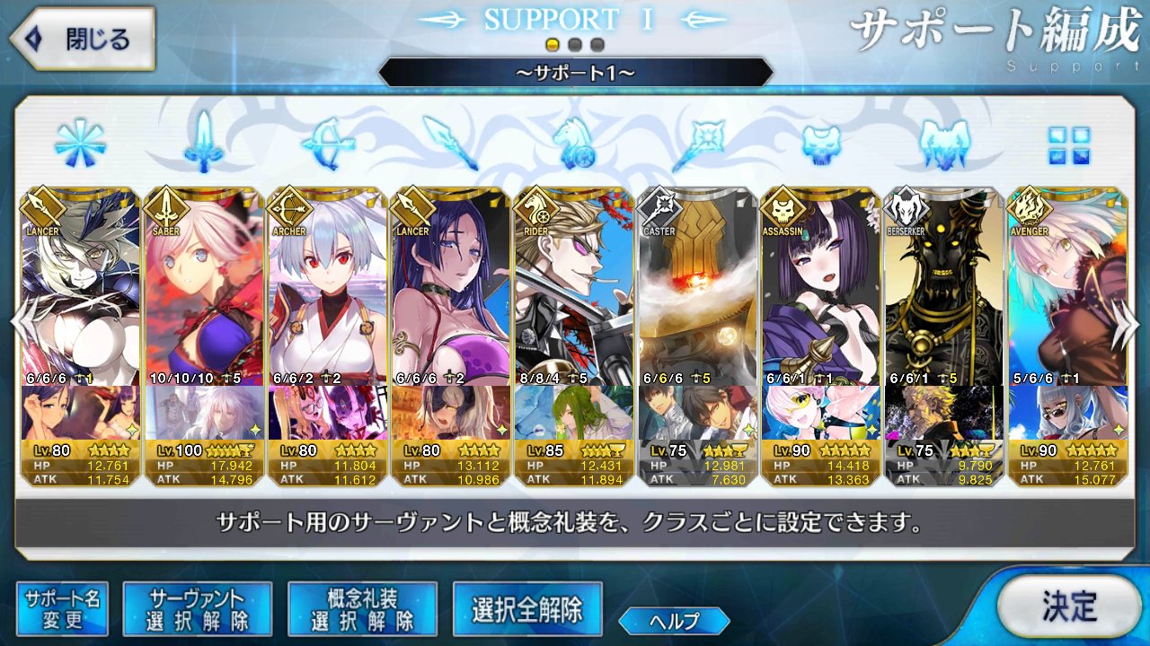 サポートならイベントでなければこういう面子かな。剣は武蔵ちゃんやアーサーもスキルMAXだけど、ここ最近は宗矩が担当してる。