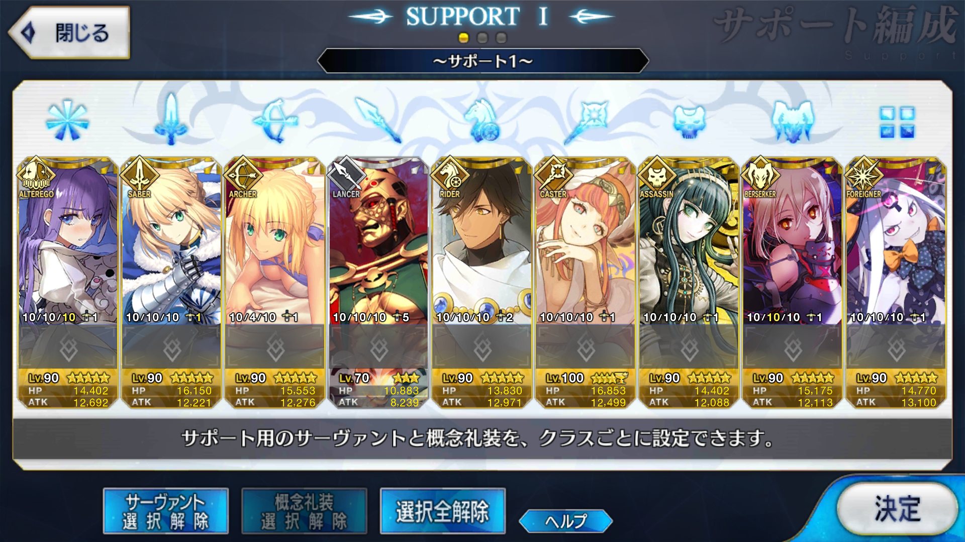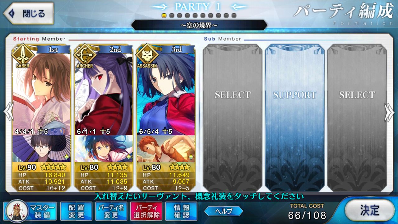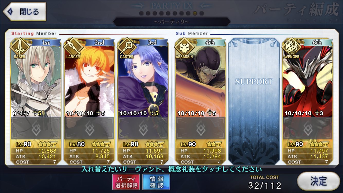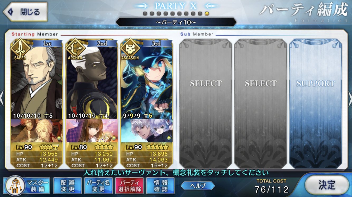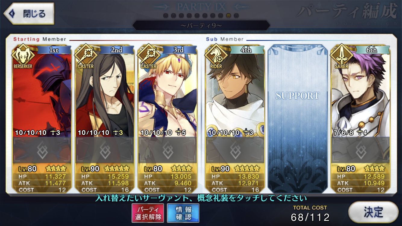 サポートならイベントでなければこういう面子かな。剣は武蔵ちゃんやアーサーもスキルMAXだけど、ここ最近は宗矩が担当してる。