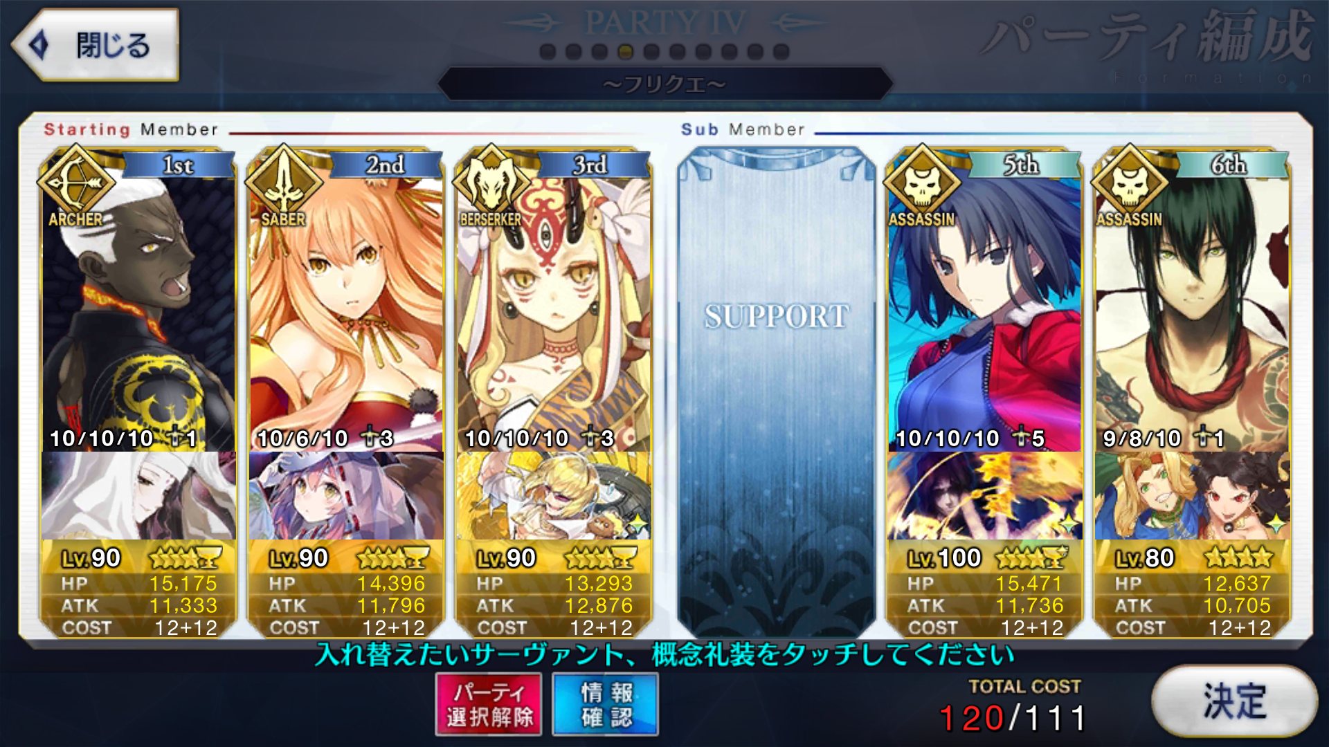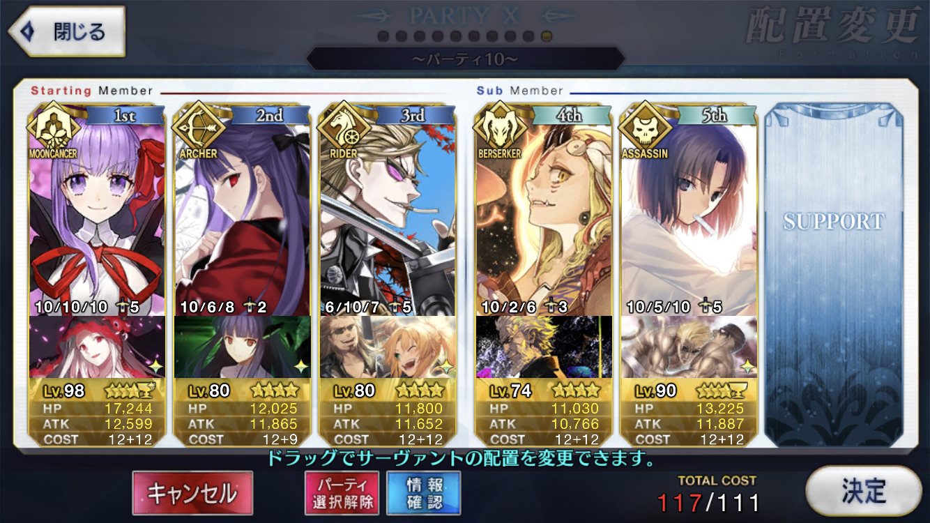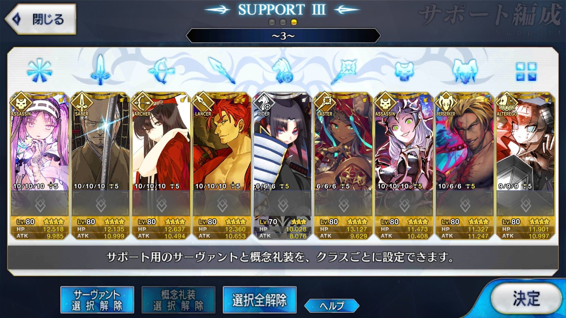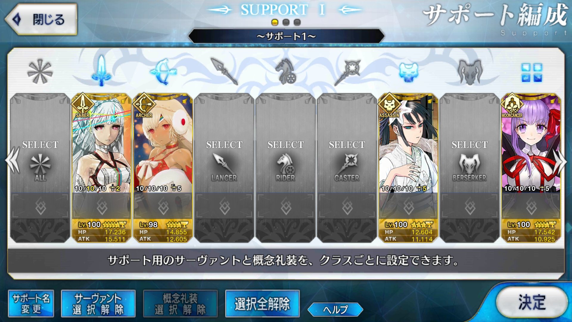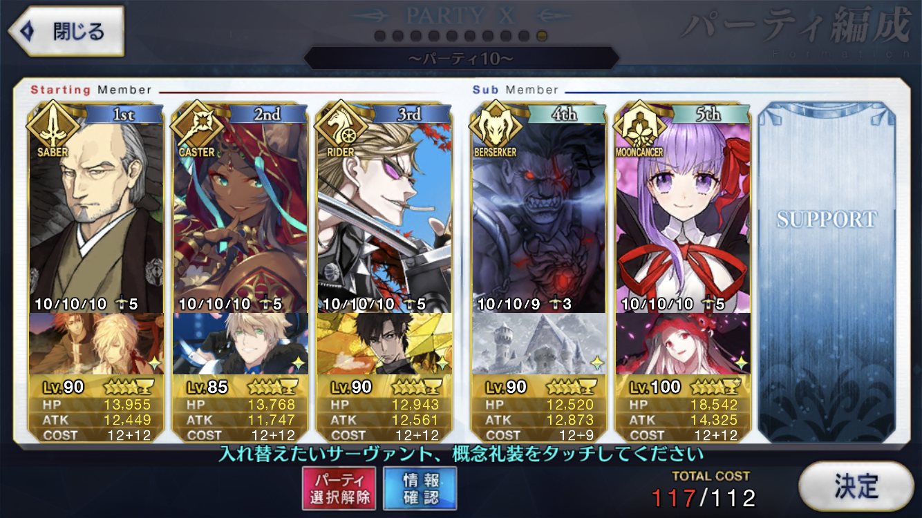 サポートならイベントでなければこういう面子かな。剣は武蔵ちゃんやアーサーもスキルMAXだけど、ここ最近は宗矩が担当してる。