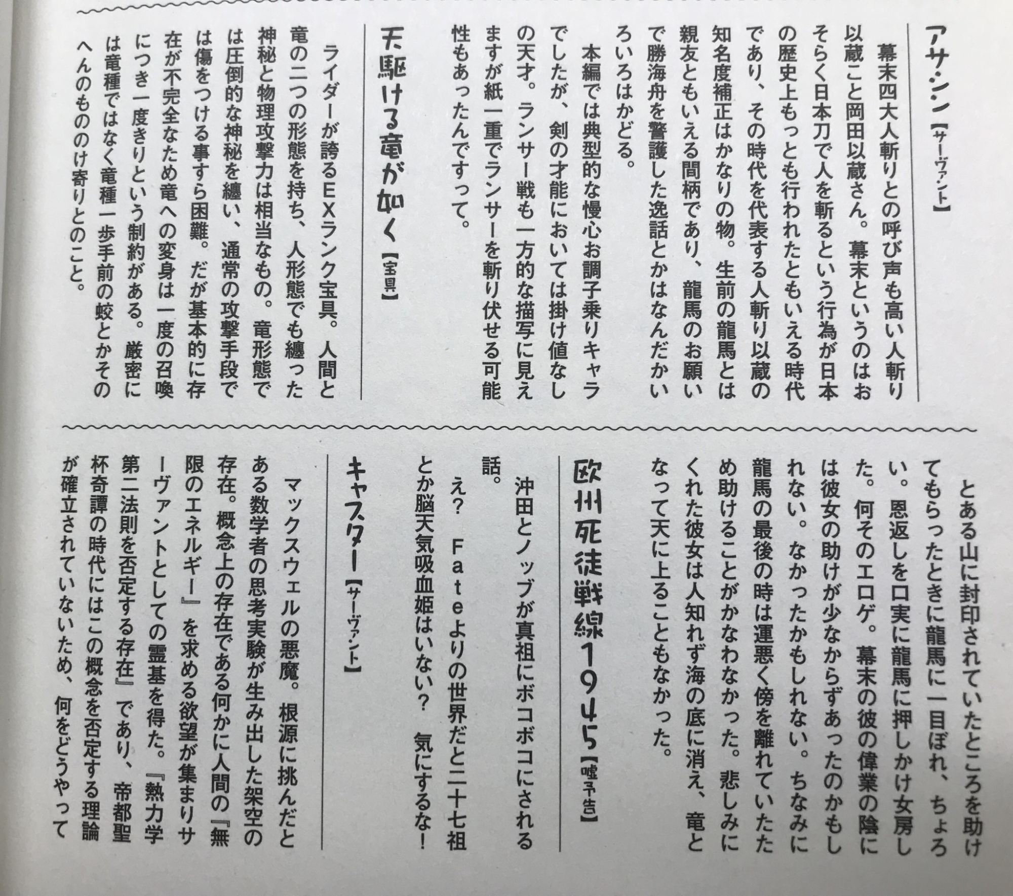 マックスウェルは色々特殊すぎてこのパターンでも実装が難しいが。沖田オルタの元々の設定的に再臨とスキル上げに剣、弓のモニュとか石使いそう