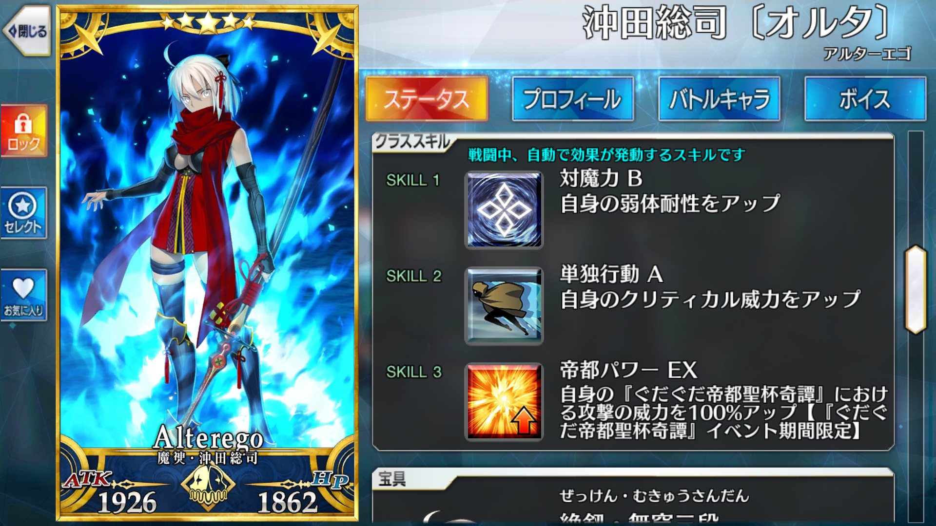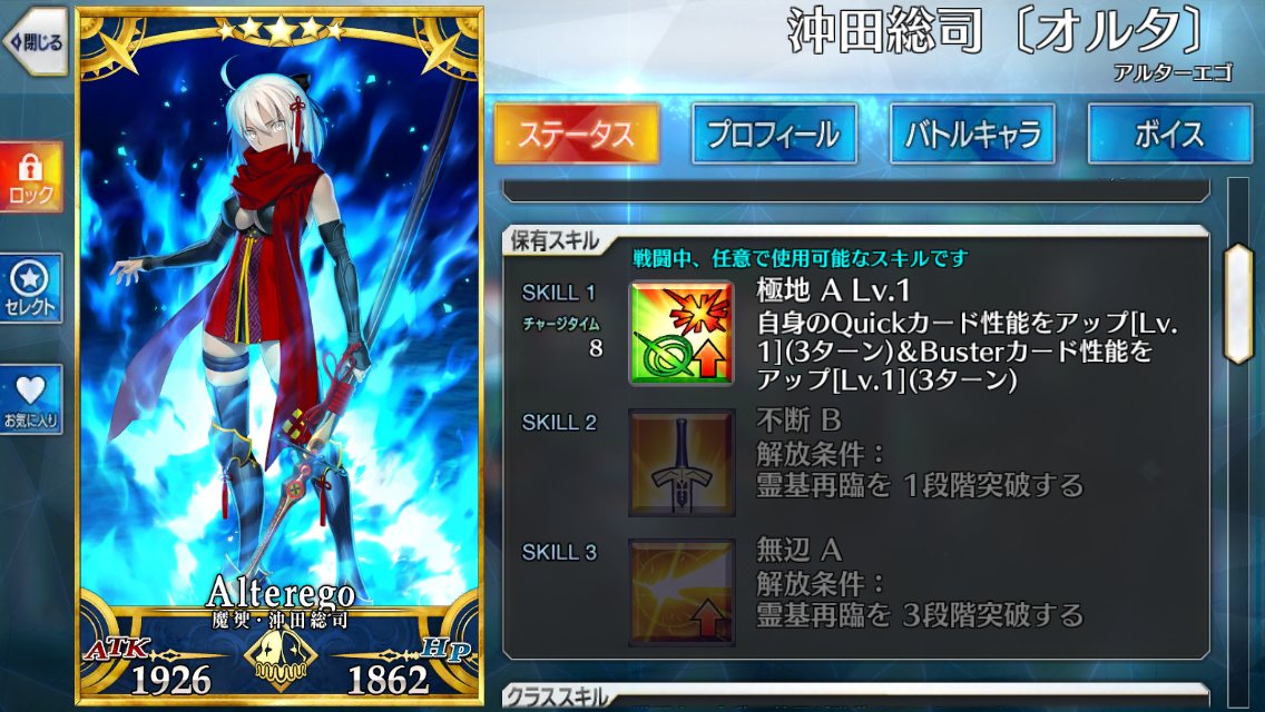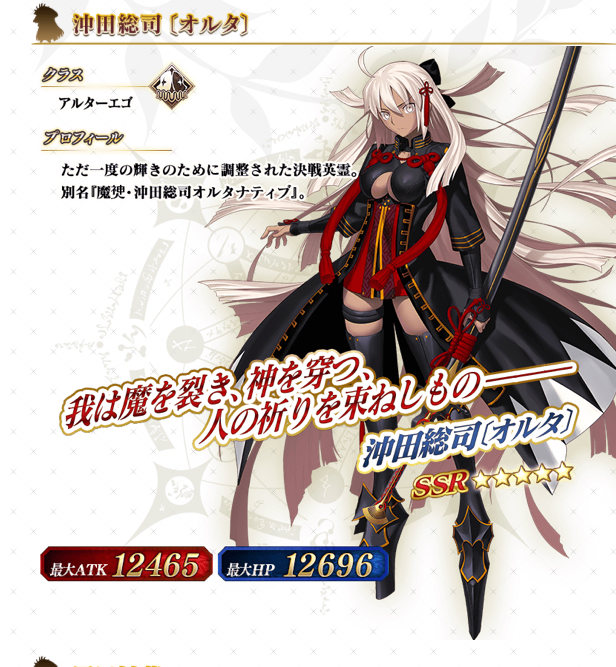 これはカッツには及ばないまでも割と餌食にされそうな予感が…顔つきも割と童顔系というか、そこまでいかついわけでもないし沖田オルタって事は沖田さんのどシリアスな面が見られるということか?
