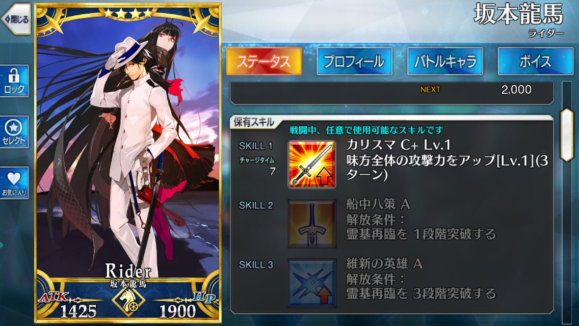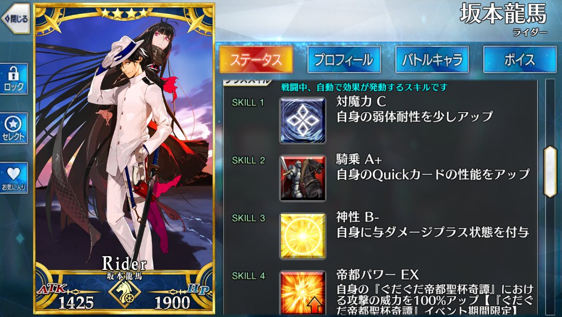 Qが5ヒットもしてたりカード性能も高そう。竜馬の宝具、CMver、土佐弁、ギャグの台詞三パターンあるやんけ!