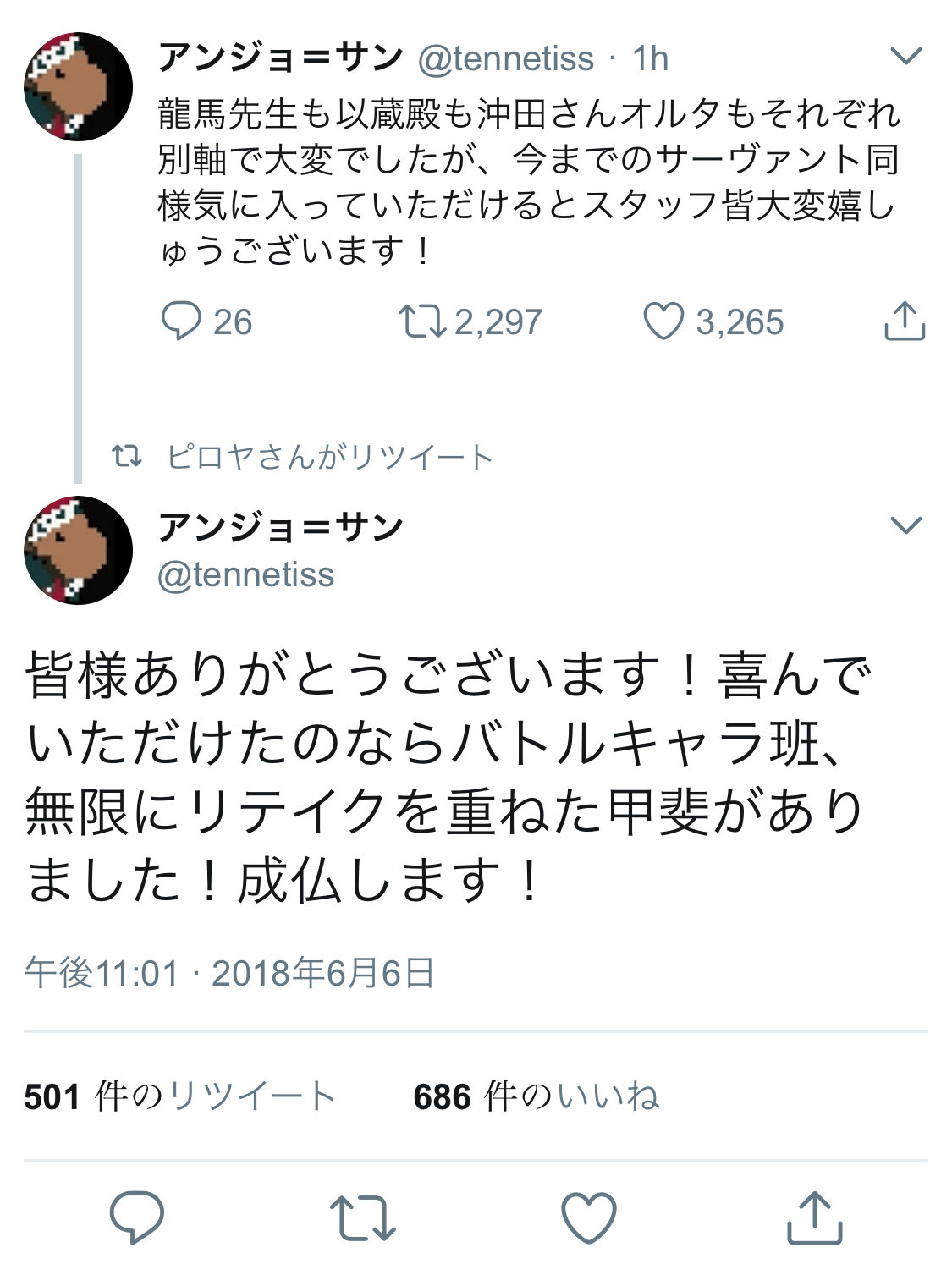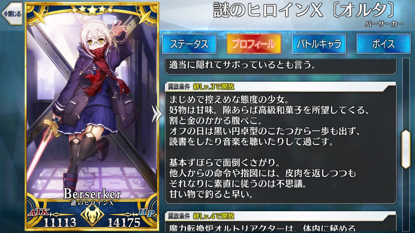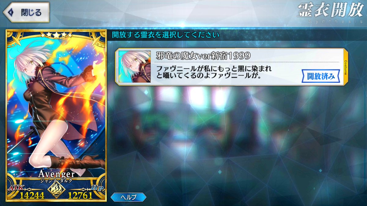 ……ふだんと変わらないドヤ顔の邪ンヌさんが、なんか少しだけ寂しげに立っていたので、俺はそっとランダム機能をOFFにした。お竜さんマイルームでアルテミスに言及ないかなあ。押しかけ人外同士で仲良くして欲しい