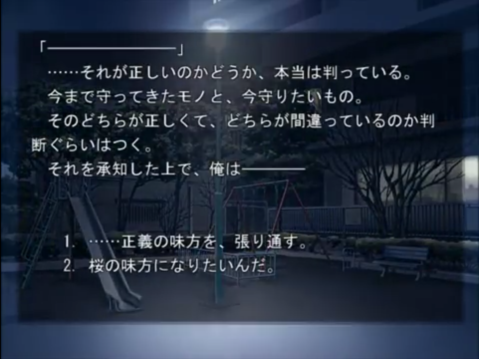 見かける範囲だとトゥルー派の人が多いんだけど自分はノーマルも至高の終わりというか消化不良だハッピーエンドじゃないの嫌だって意見も分かる