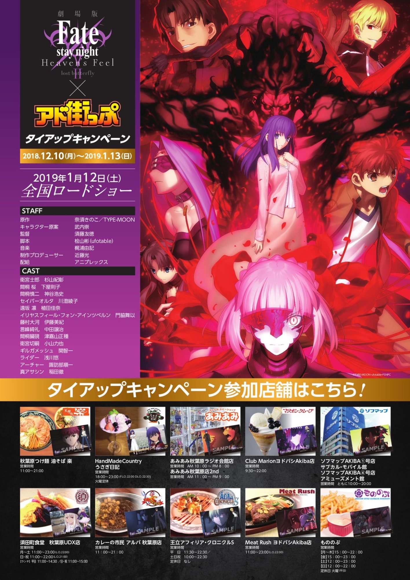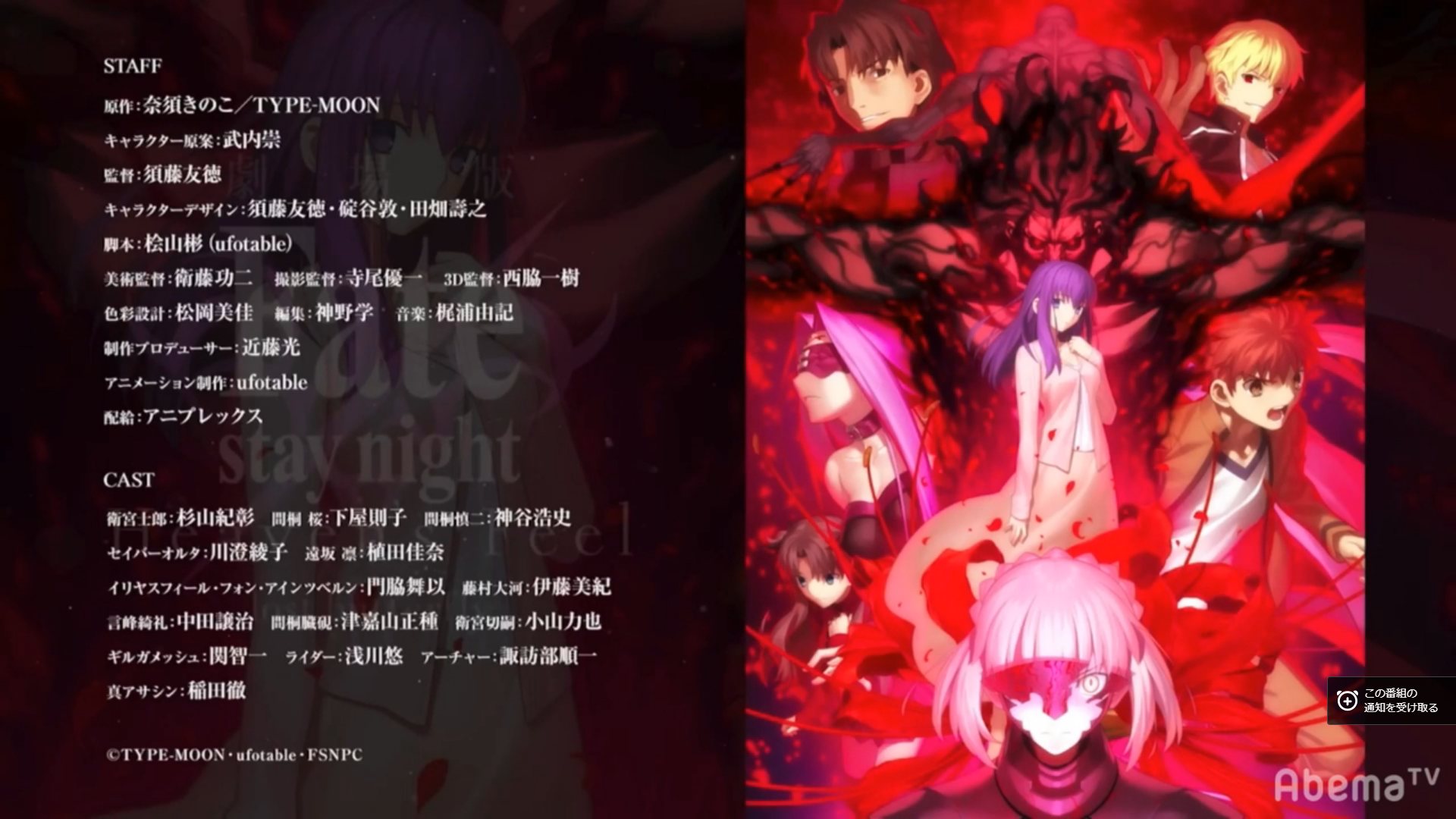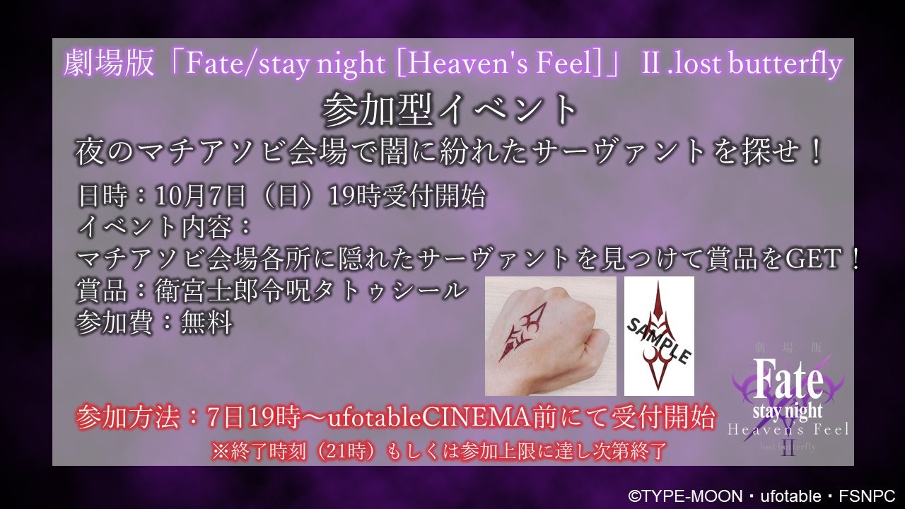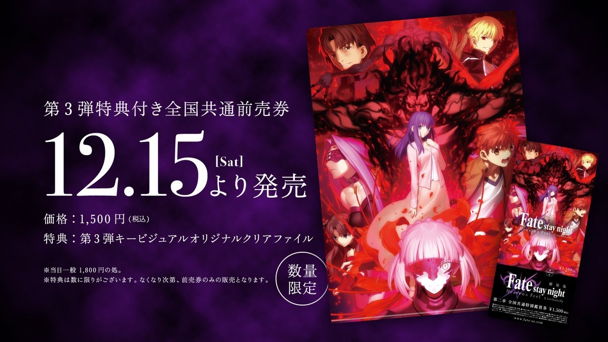 1章は128館だったから少し増えた。それにしても11年前、TYPE-MOON×ufotableの最初の作品「空の境界 第1章」の時はテアトル新宿の1館のみだったプロジェクトがここまで拡大したのは感慨深いものがある。一方で今でもちょっとしたイベントではテアトル新宿に当時のスタッフ・キャストが集まってイベントをしてくれるから嬉しい。今年中じゃないのが少し残念だったけど、その分クオリティも上がって