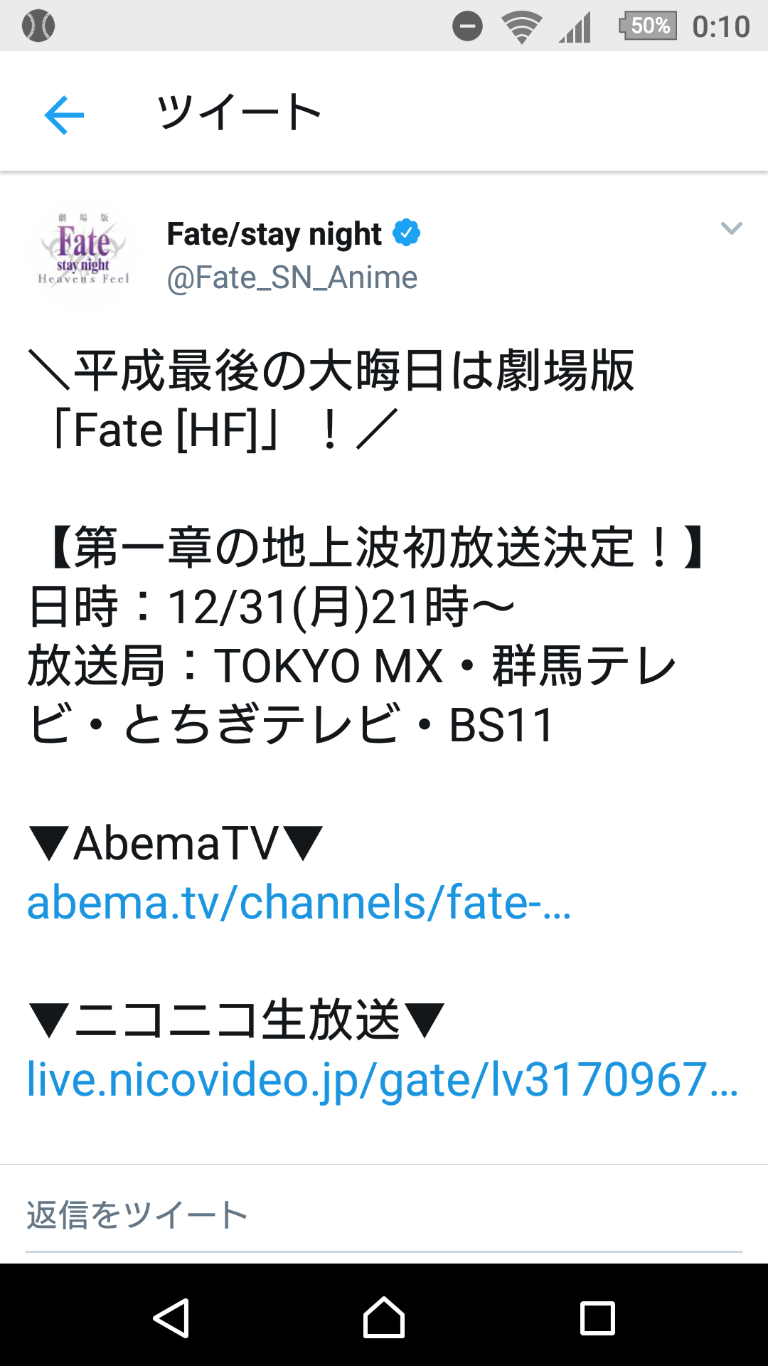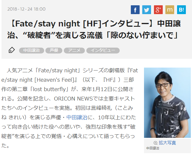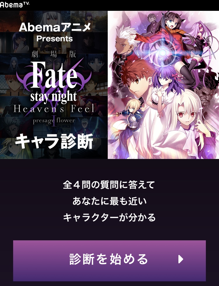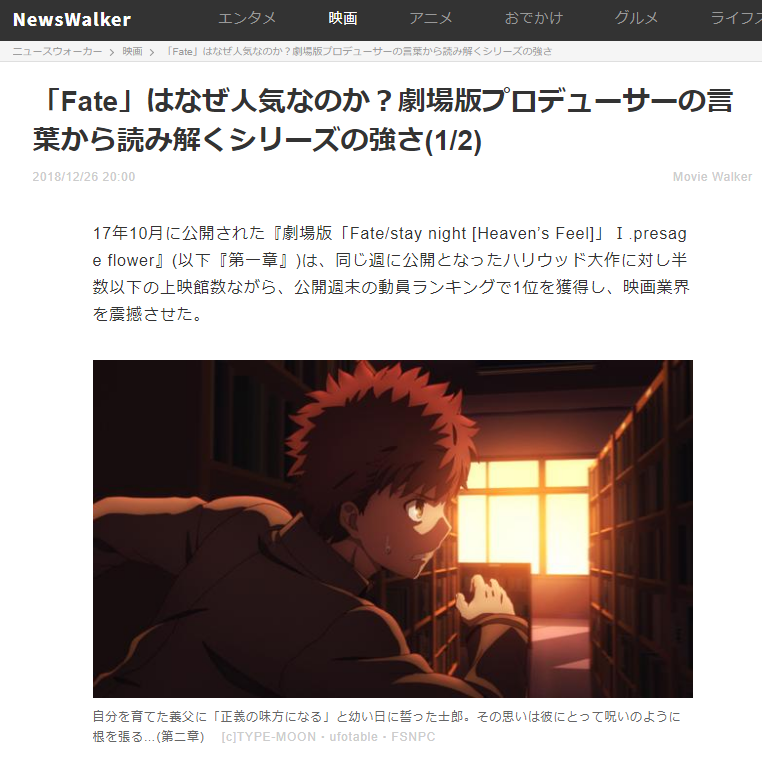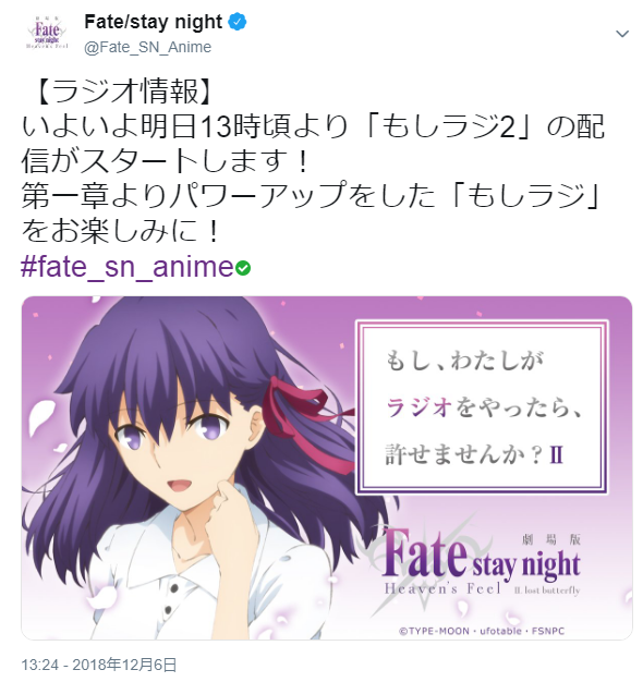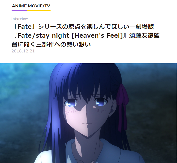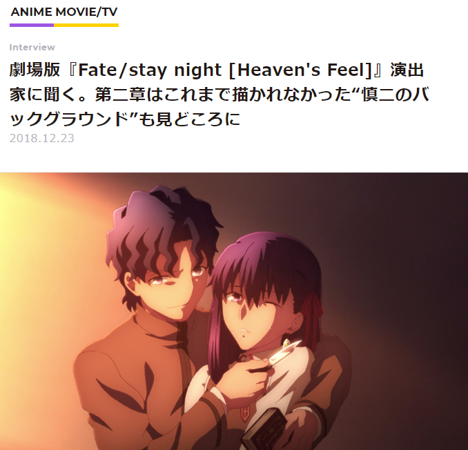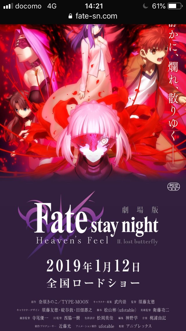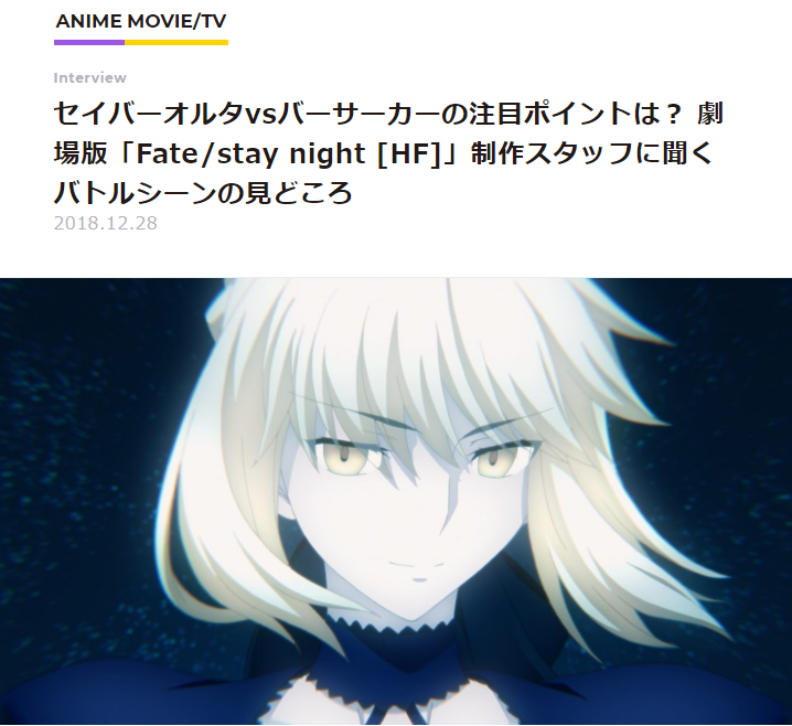 https://twitter.com/Fate_SN_Anime/status/1082098870643879936やっと録画してたHF1章見れたけどほんと戦闘シーン凄い・・ランサーVS真アサシンの所とか。2章はどこまで進むんだろ・・