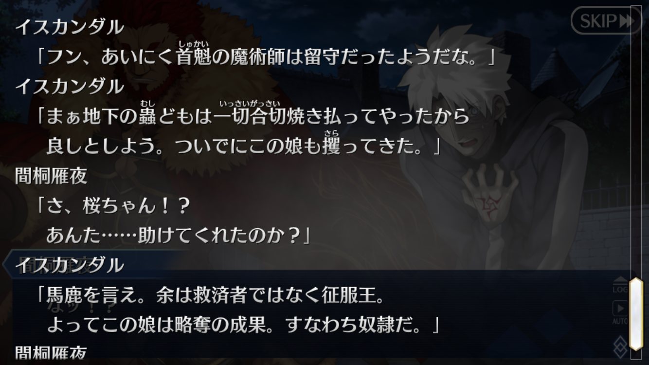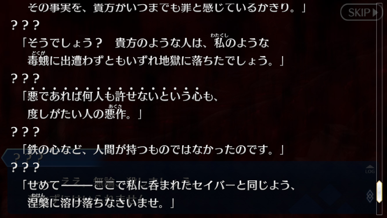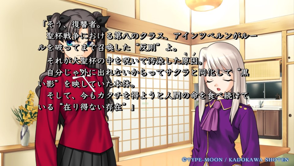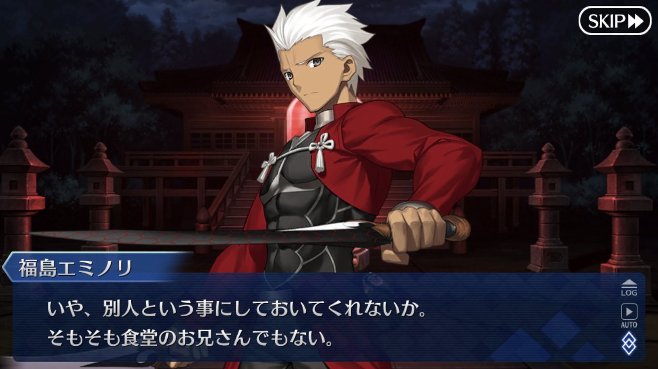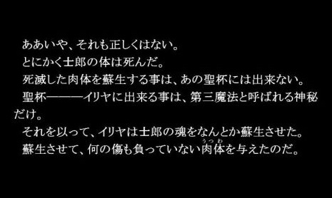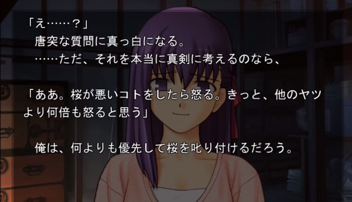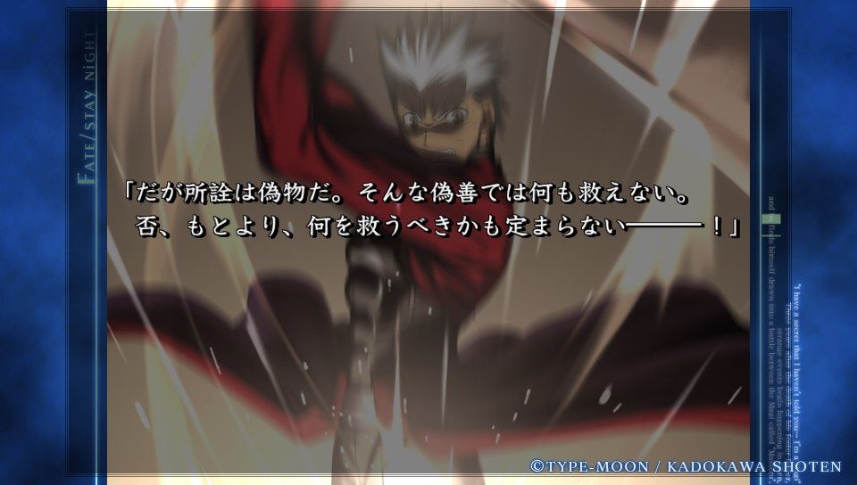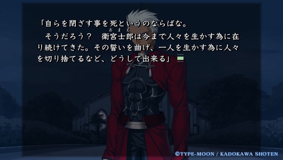 「だがそれはあくまで次の話。今のオレの目的は、衛宮士郎をころす事だけだ。それを阻むのならば―――この世界は、おまえが相手でも容赦せん」テ