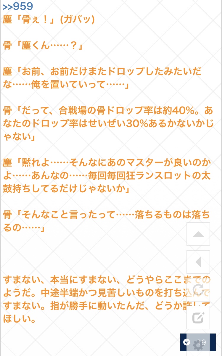 ちなみにぐだの場合、悟ったような諦めたような、しんだ魚の目になって乾いた笑いを上げる。>>96