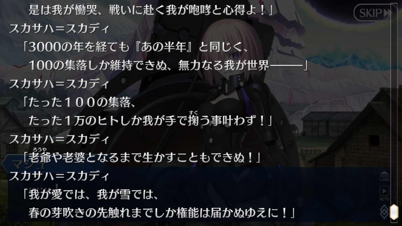 4節をちょっと進めてゲルダちゃんの集落でお泊まりした所で今日は寝よう……もう既に北欧異聞帯滅ぼすのがつらい……つらいよぉ……