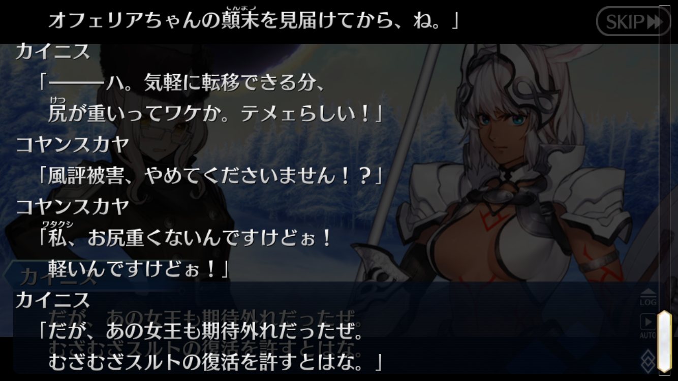 とは言えコヤスに悪態ついて読者のガス抜きこなすあたりかませでは終わらなさそうスカサハ・スカディの首がなんか気になる……シルエットの時、髪の隙間(?)の位置もあって「あれ?首長くね?」って思って、姿が見えるようになってからも「なんか違和感ある……」ってなって、年齢考えない服s綺麗な服に再臨してからは「あれ、そうでも無い……?」ってなった。