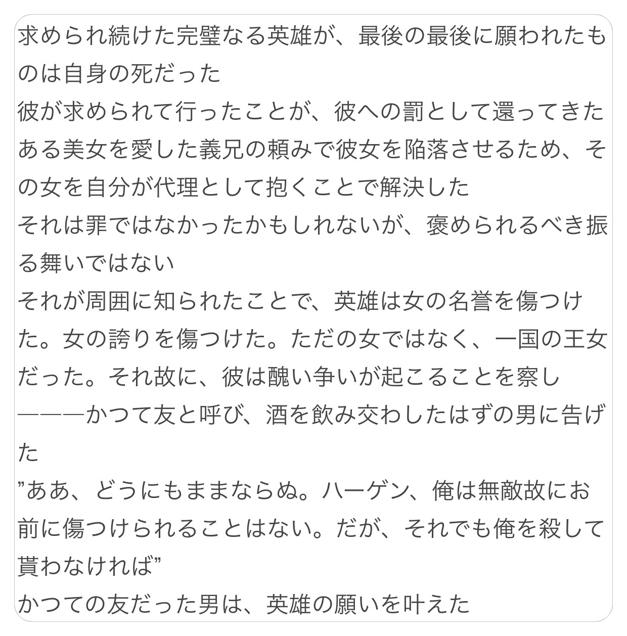 マスターが士郎だったり召喚が特殊なアレコレじゃないとズルいわニーベルンゲンの歌の後半のハーゲンへの復讐の絡んだ惨劇、ヨーロッパの英雄でもかなり上に食い込むだろう実力を持つ剣士や王、そしてアルテラなどが入れ混じる下手すると一つのでやるようなら壊滅しかねないほどの戦いしてたんだよな。