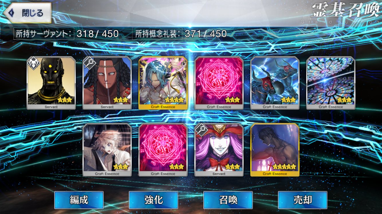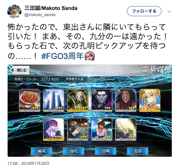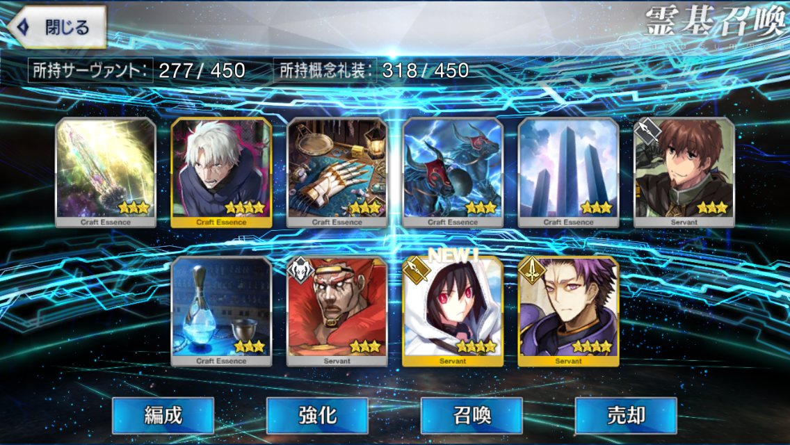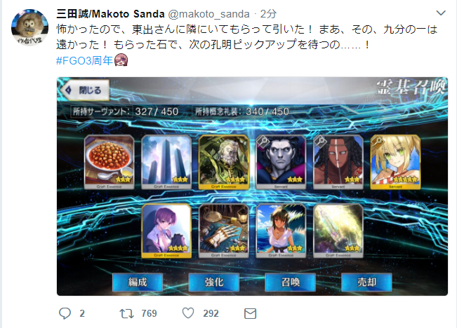おや同士がいたか。私も今回シグルドピックを回しに回し、恒常の星4達たくさんが出たは良いが、種火が足りぬ。素材も足りぬ。時間も足りぬ。ついでに育成途中の子もいる。とりあえずこの期間は一人に絞って、ネロ祭でフィーバーするしかねぇ……>>908