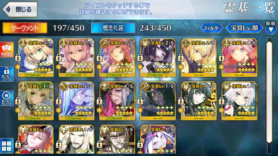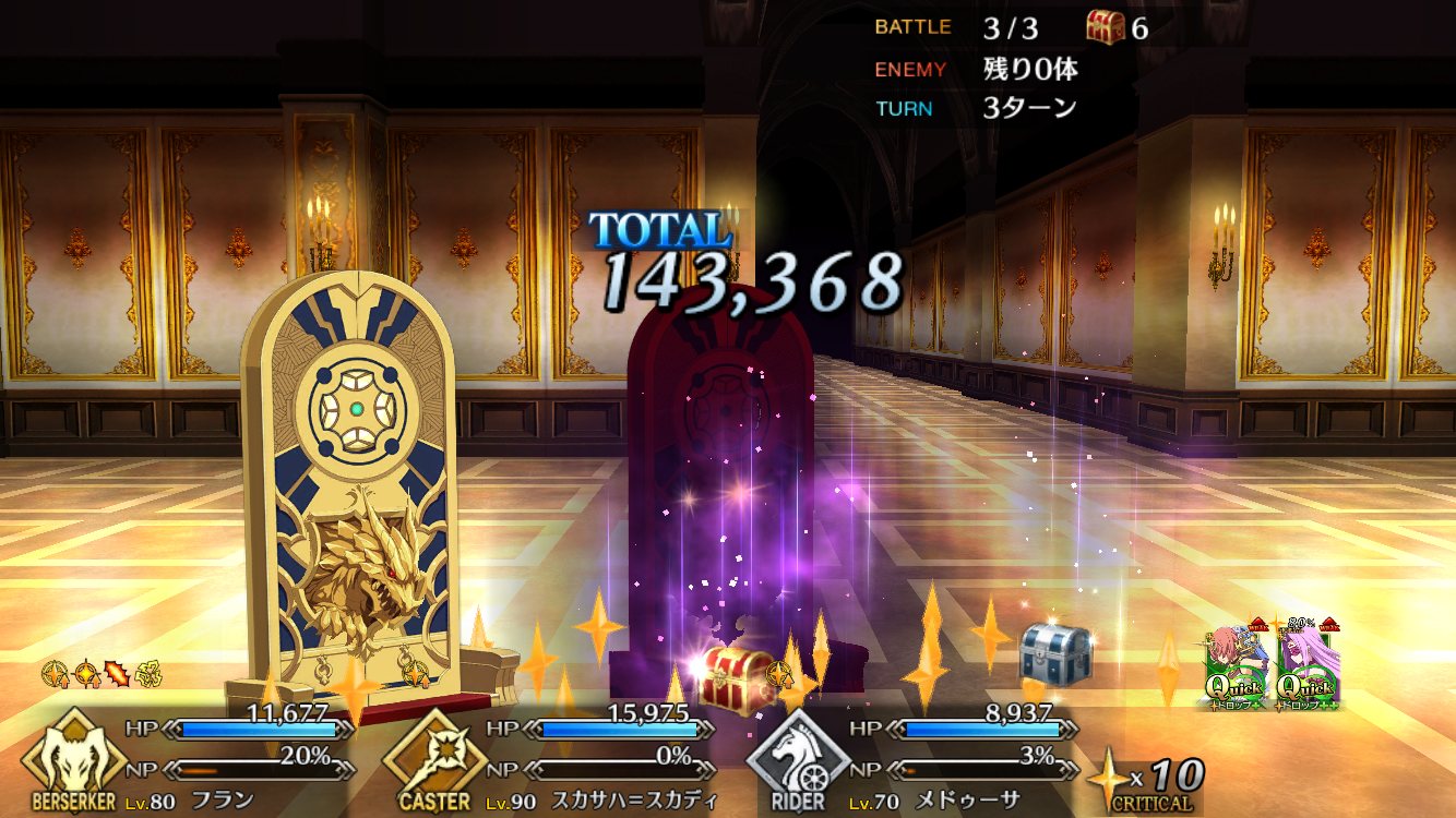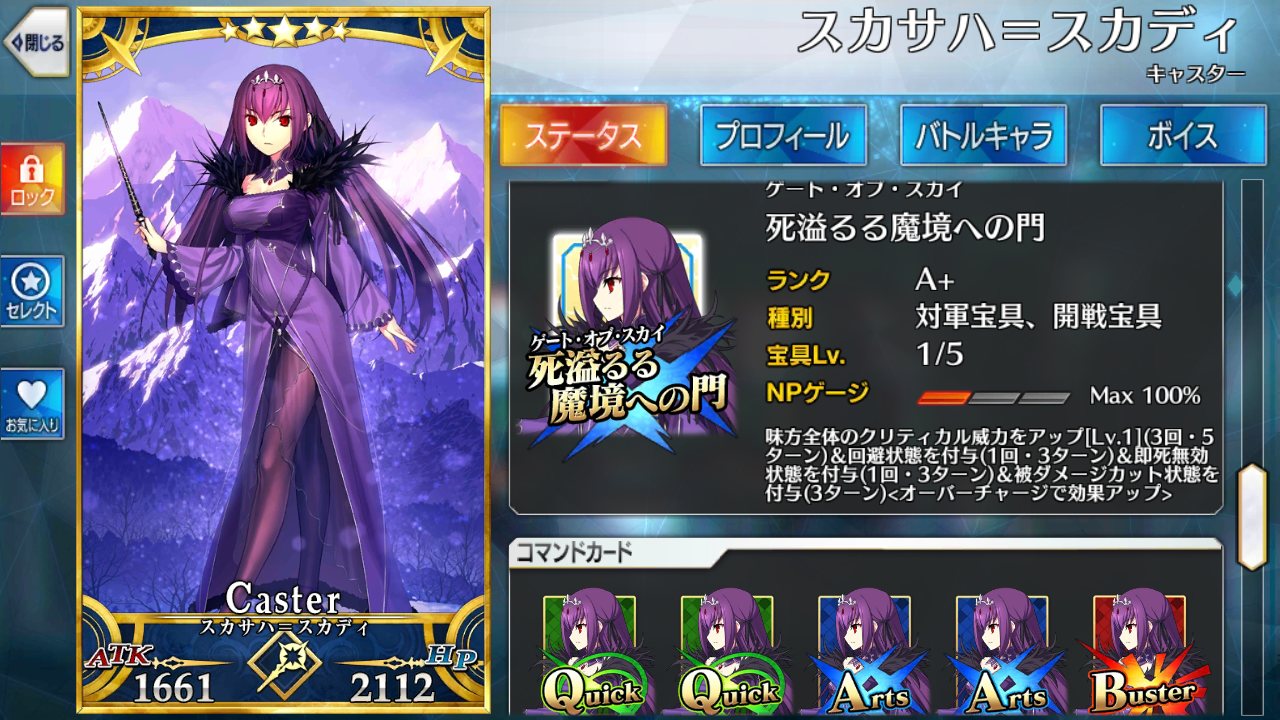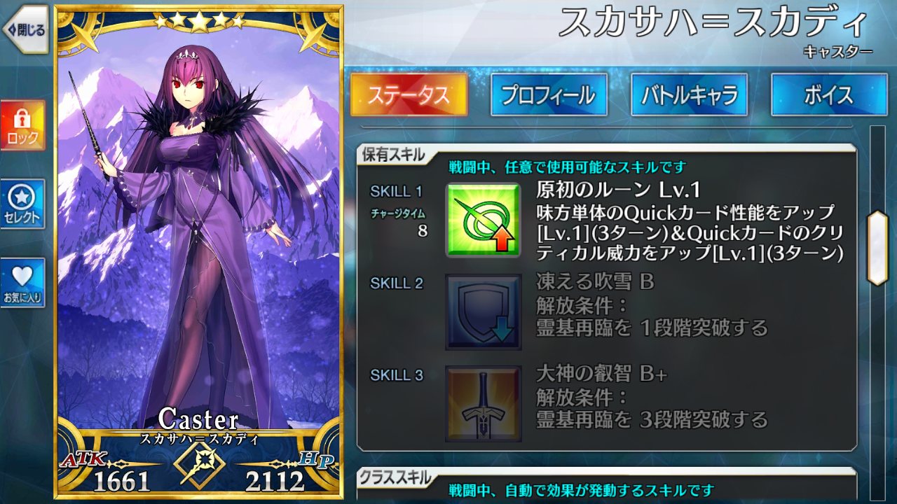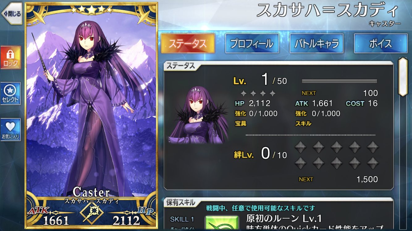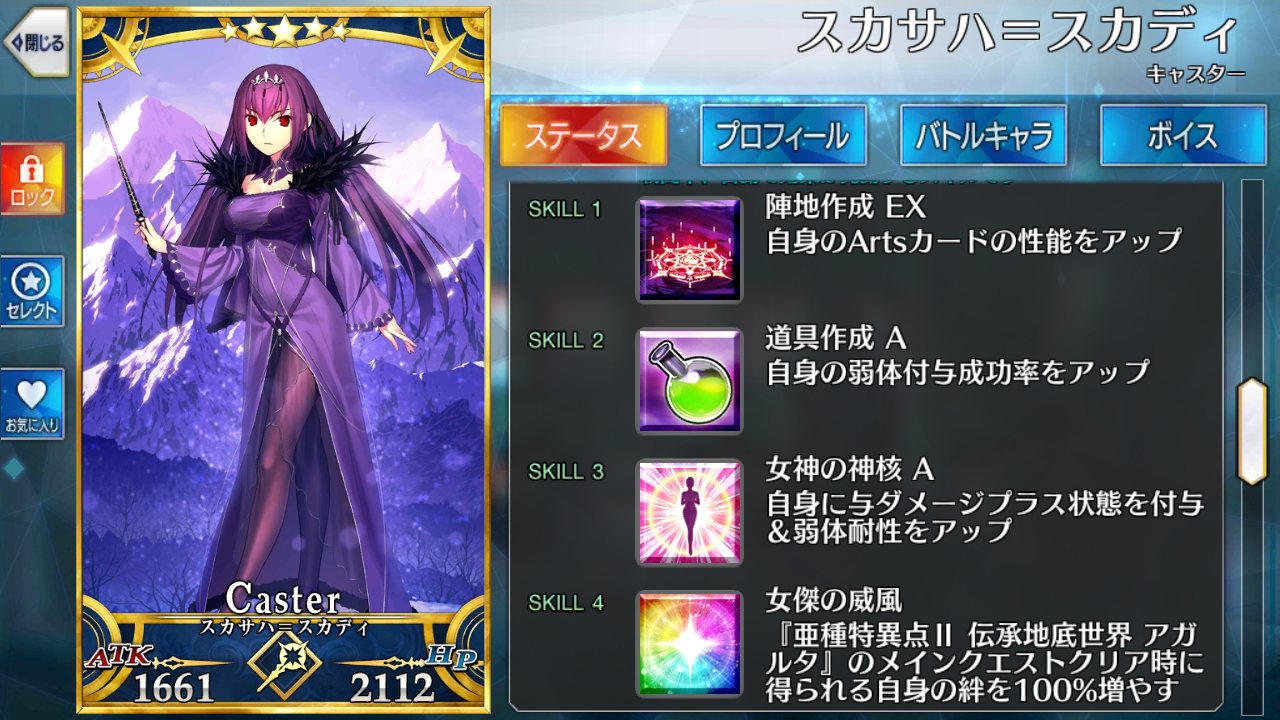 邪ンヌに対抗できる点を挙げるなら、かなり高い倍率の攻撃up付くスキル1とレベルマで星20個出せる上にチャージ減もできるスキル3かな なんでそこ活かすためにクリティカルアタッカーにしましょう!凸バゼットさん礼装があれば弓と同じくらい星が集まるので、スカディ様や新茶でバフ足せば面白いように相手の体力が溶ける上に更に星がいっぱい出てくるぞ!始めた時期的に差分200には届かなかったけど石めっちゃ貰い、スカディも結構早く来たから今見たことない数の石がある