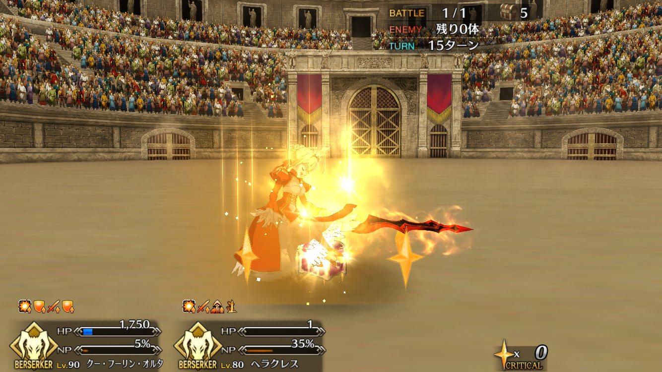 幸運の末にクリアして課金勢の友人に「勝ったよー」と送ったら「じゃあ俺もやる」っつって即刻クリアされたがなぁ! 納得はするがぐぬぬってなった。ネロ祭りエキシビションマッチ全般かな