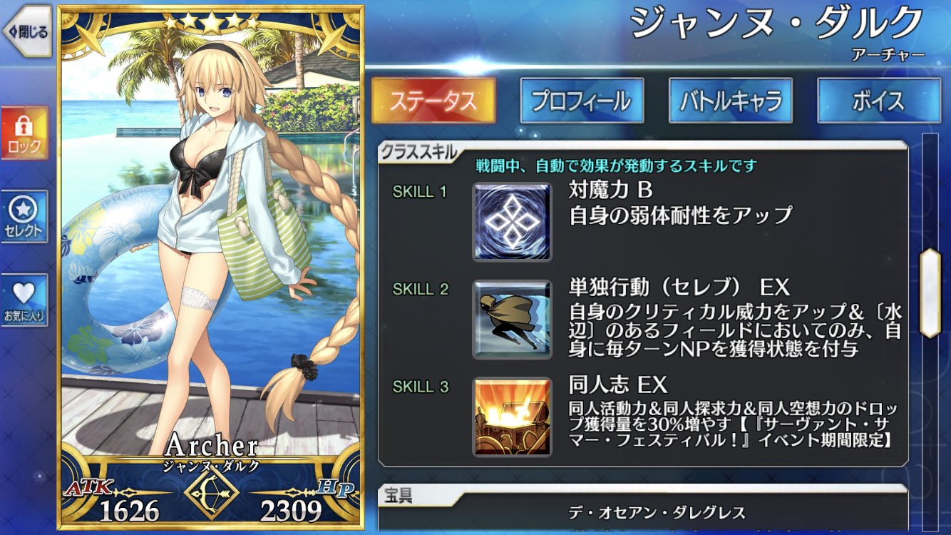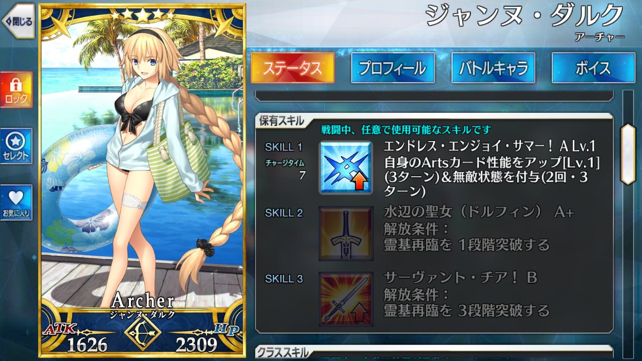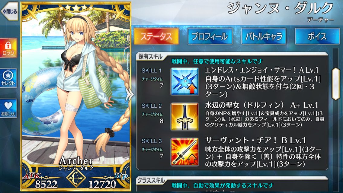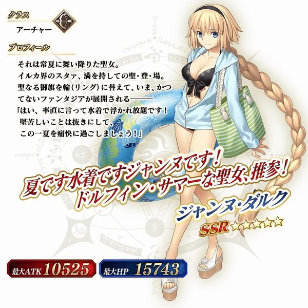 水着前は色々と心配していたが蓋を開けてみればテンション高く夏をエンジョイするジャンヌさんというだけだったし、まさかのジーク君宛ボイス追加というサプライズもあったし嬉しい限りだ>>900