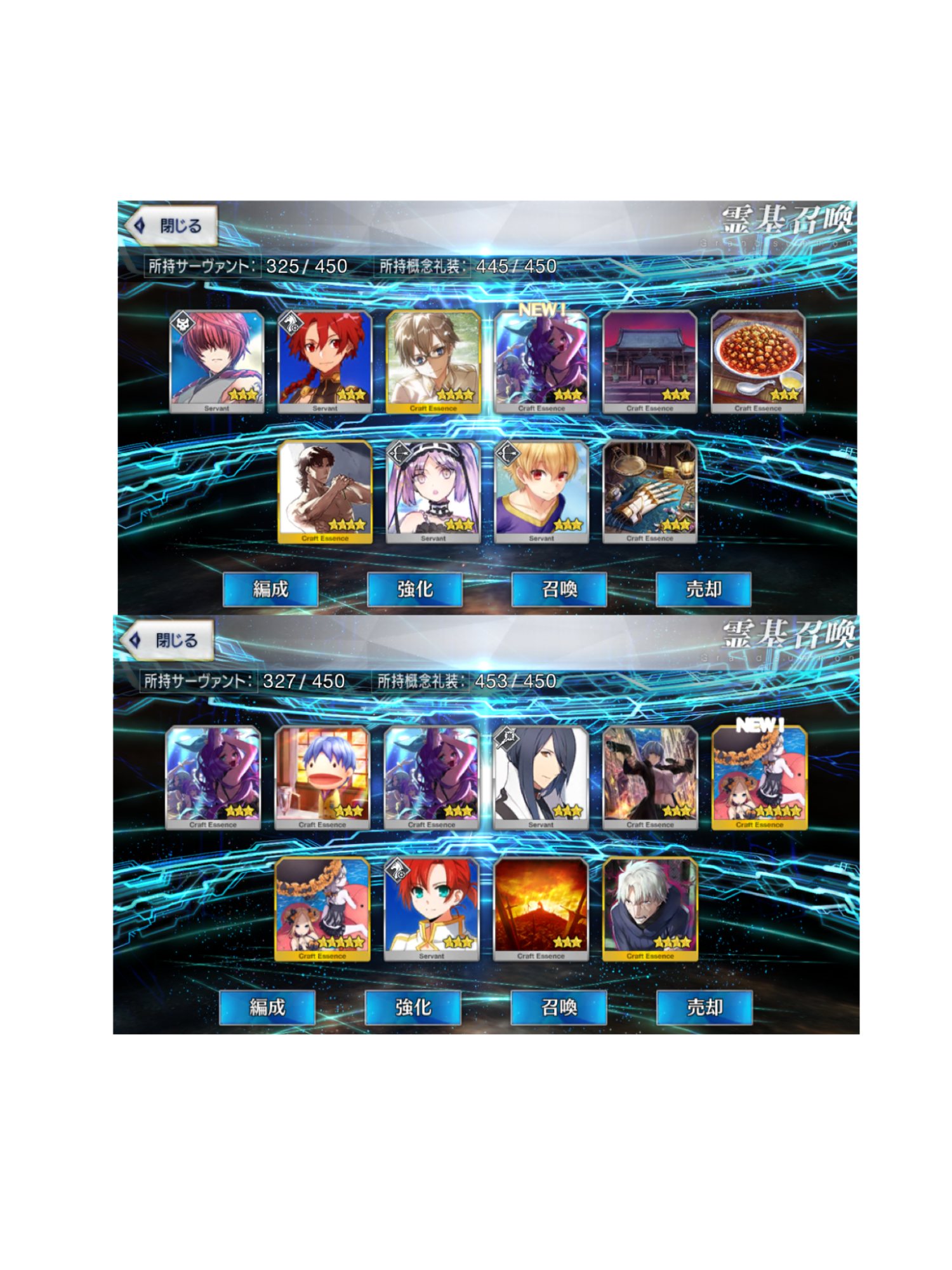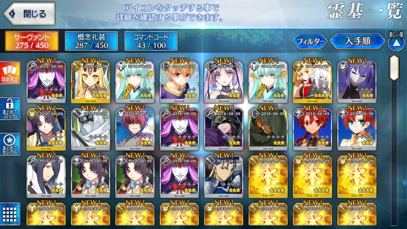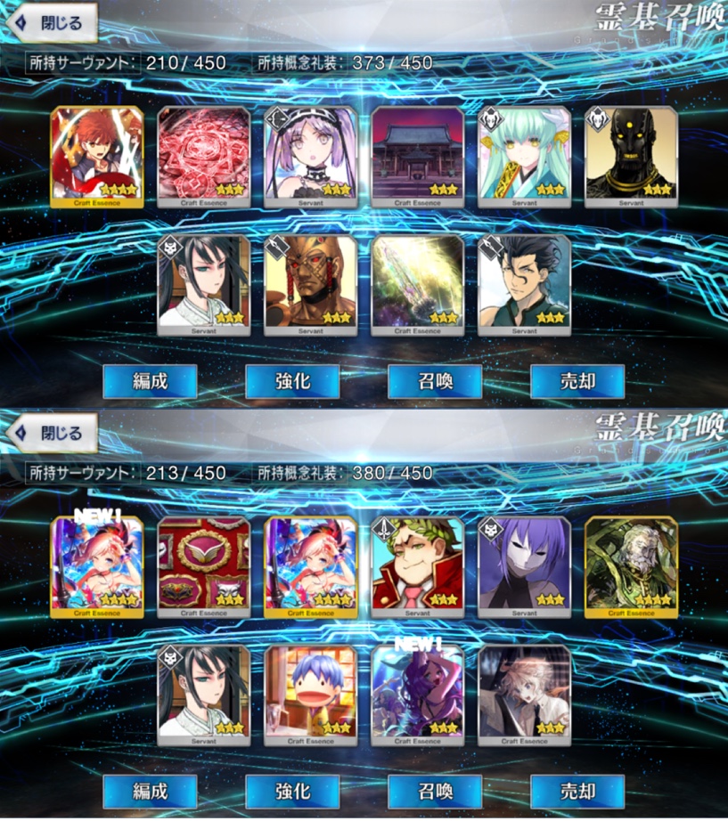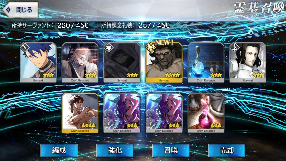 まぁまぁ、世の中には3万入れて星四以上のサーヴァント0に星五礼装0のイベント礼装がこれだけだったやつとかいるから。下には下がいるから。みんなの不運は全部地獄の底まで持ってくから虹回転で期待したらオジマンが宝具2になった