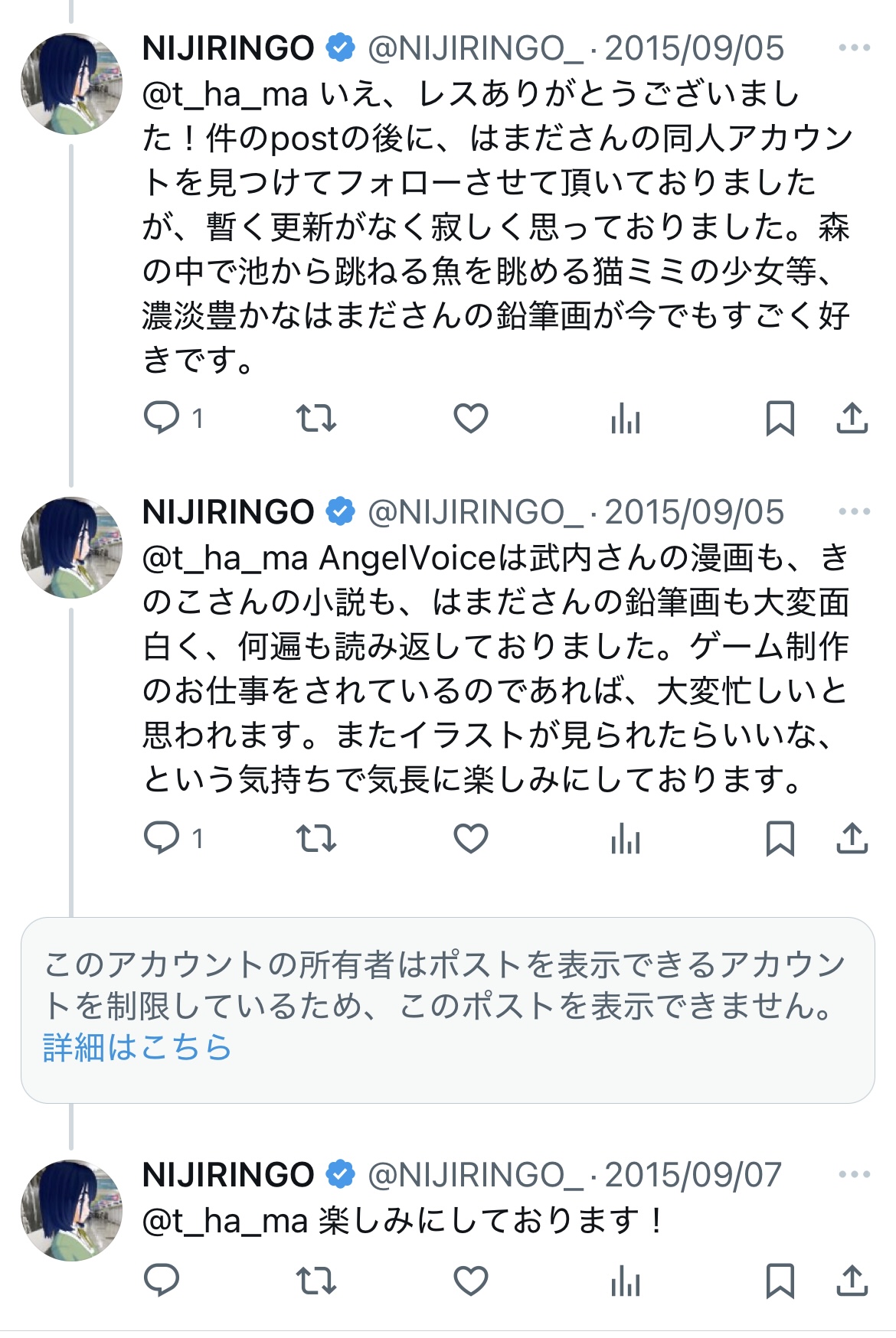 このツイートにリプライしたのがはまださん本人みたいだから2015年までは本人確認できるよ