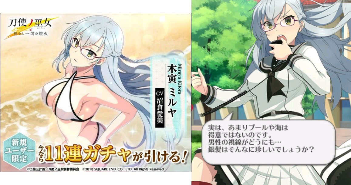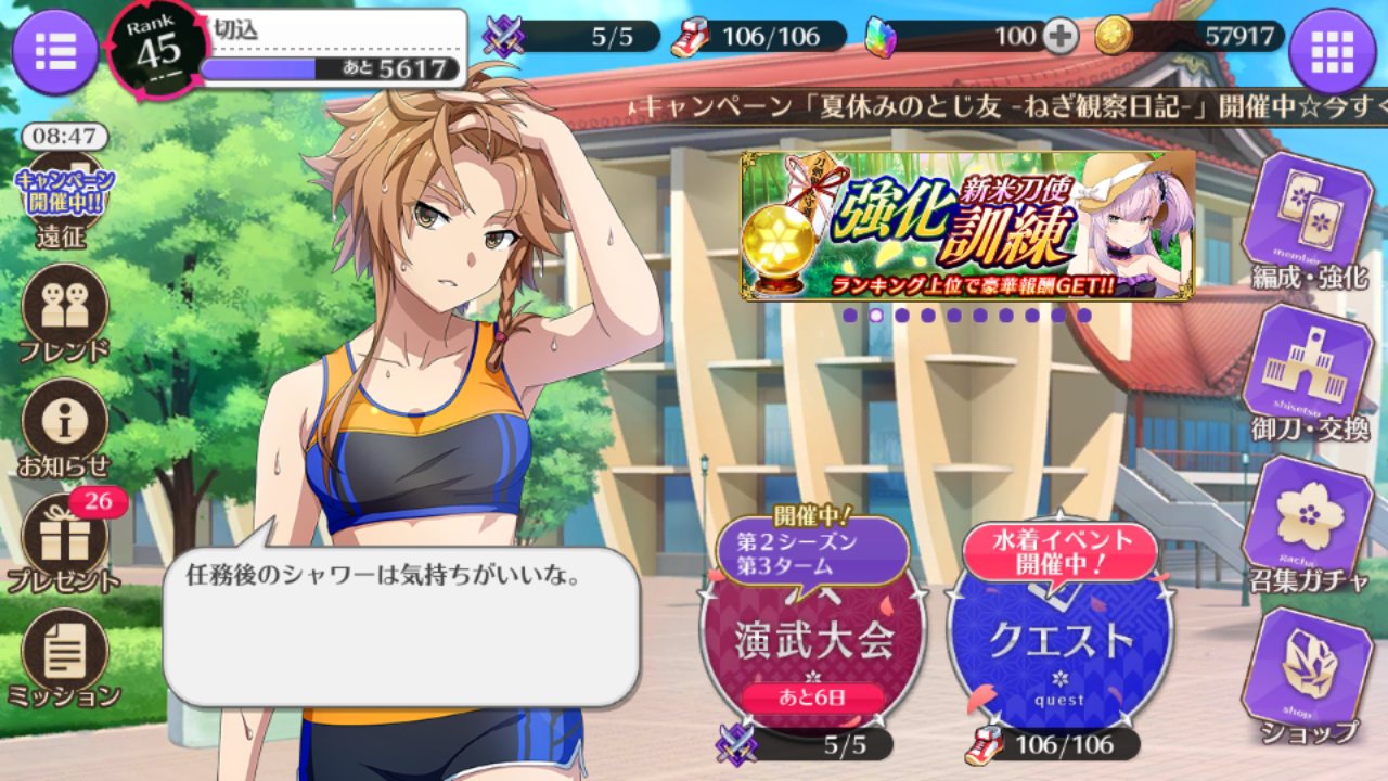 50連か60連くらいガチャったら水着瓶ちゃん来ずに鬼神丸と千代金丸と古今伝授の太刀が新規で来たよ・・・。