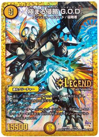 デッキとしては半分くらい9コストの重量級クリーチャーというかなりピーキーな構成、一度G.O.Dが出ると神の如く圧倒的な展開力を見せつける。