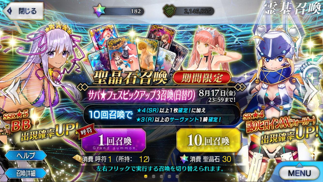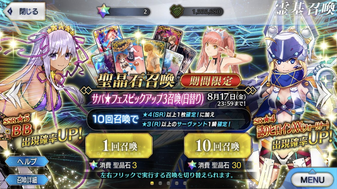 2時30分までにいいねが20行ったら、水着BBちゃん&サンソン関係鯖(ナポレオンやコルデー等)のピックアップがくるまで石貯めます!