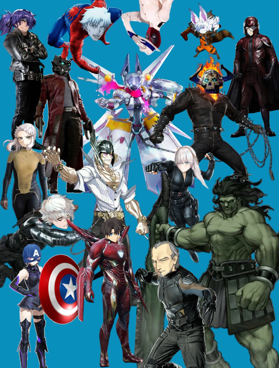 まずはアナスタシアはロマノフ繋がりで女スパイ『ブラックウィドウ』、カドックは某国で生まれた秘密組織の暗殺者『ウィンターソルジャー』、藤丸はハイテク装備で固めた『アイアンマン』、盾持つマシュはスーパーソルジャー『キャプテン・アメリカ』、毒舌な獣って枠でフォウ君は『ロケット』、マスクがそっくりなシグルドは『スターロード』、悪人を地獄に叩き込む幽霊のような翁は『ゴーストライダー』で、蟲繋りのカリヤーンは『スパイダーマン』、雷神な金時は『マイティ・ソー』、声優ネタで柳生、パラP、デップーは『ウルヴァリン』『マグニートー』『坂本龍馬』、ネガソニックティーンエイジウォーヘッド感が異常なペンちゃんは『ネガソニックティーンエイジウォーヘッド』。なんかいるヘラクレス。>>94
