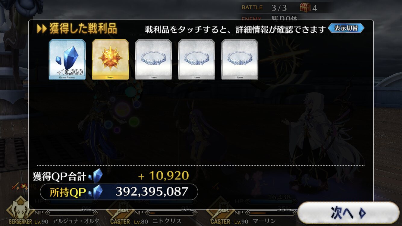 今後によっては婦長にもあげよう塵が足りない、塵が足りないィィィィイイイイイ!!もっと落として!!(スカディのスキルマとフィンの再誕分だけで100近くいる)