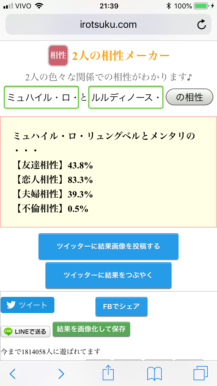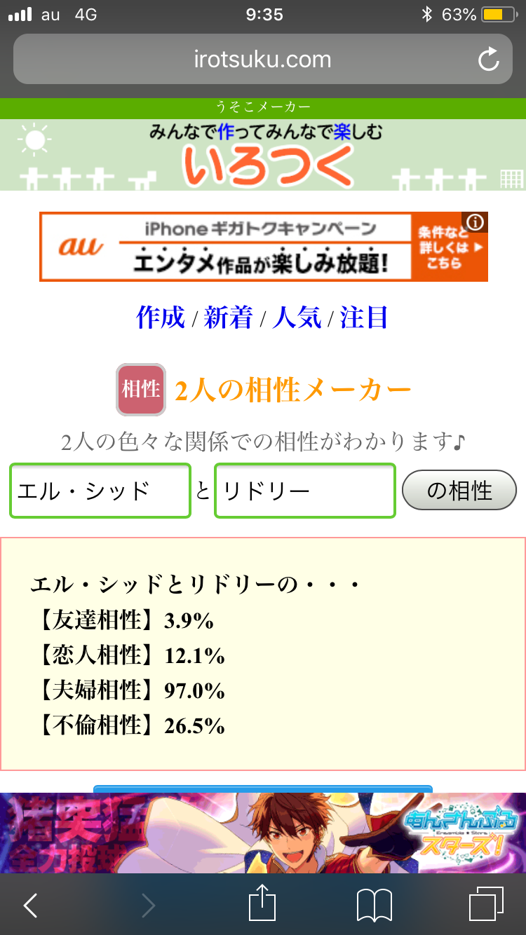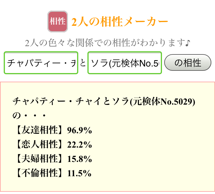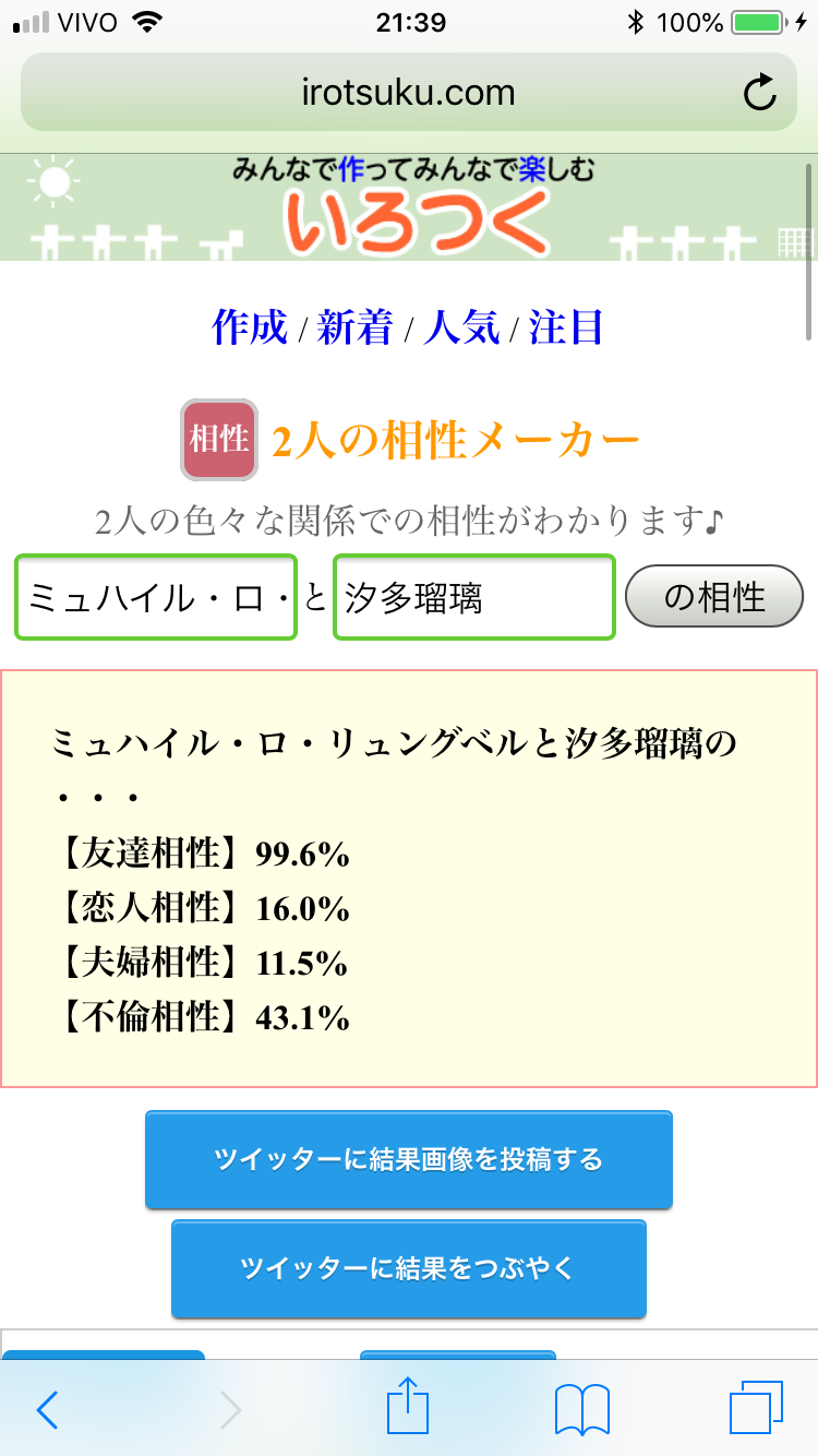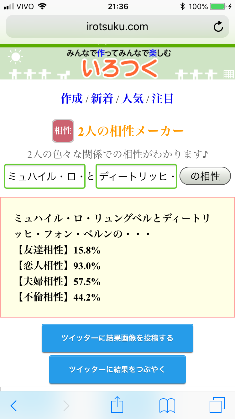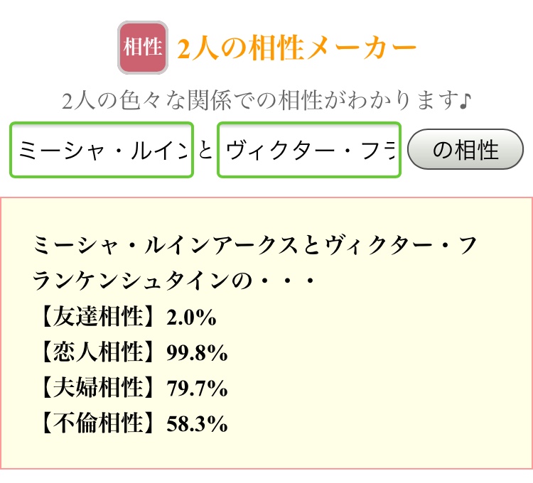 好機……!将七を布教する絶好の好機……!うちの子と政宗ちゃんでやったら不倫相性ぶっちぎりになりました(白目)