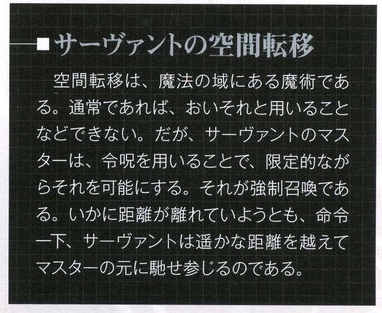 例えば、『一時間後にマスターである自分が生きていなかったら(魔力供給が途切れる・サーヴァントとしての契約などでそう判断できたら)仲間であるAの所に瞬間移動せよ、生きていたらマスターである自分の所に瞬間移動せよ』みたいな瞬間移動は絶対命令と瞬間魔力ブーストの両方使ってるタイプだからどうだろう