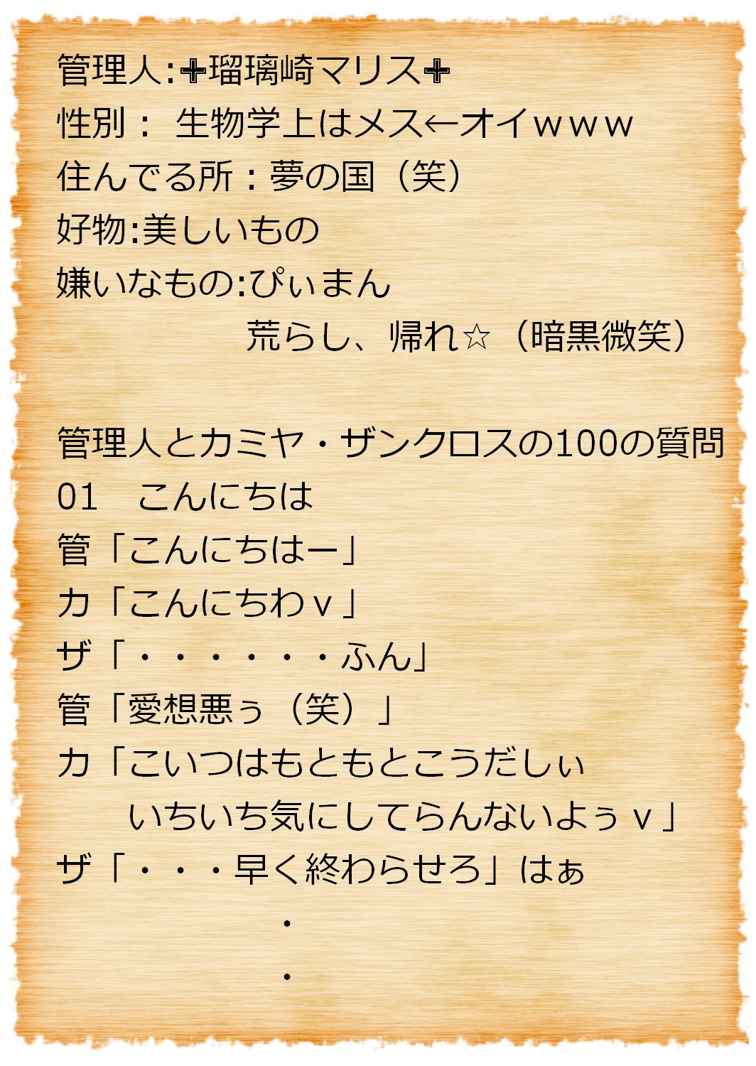 ・キャラクターとしての発言には「」をつけ、それ以外をプレイヤーとしての発言や演出とします。キャラクターとプレイヤーでレスを分ける必要はありません。