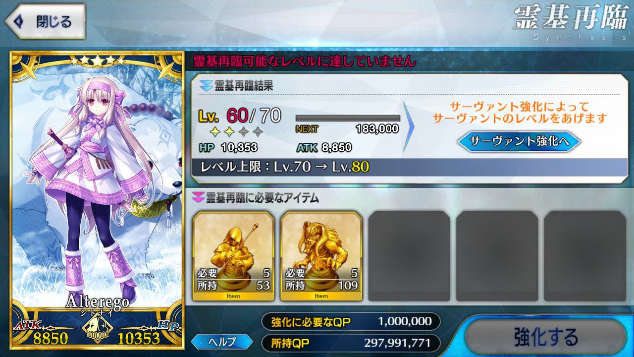 せやな(レジライの方見ながらそんな高価な素材とQPジャブジャブ使わないと強化できないサーヴァントってやっぱ半端ない存在なんだなって……