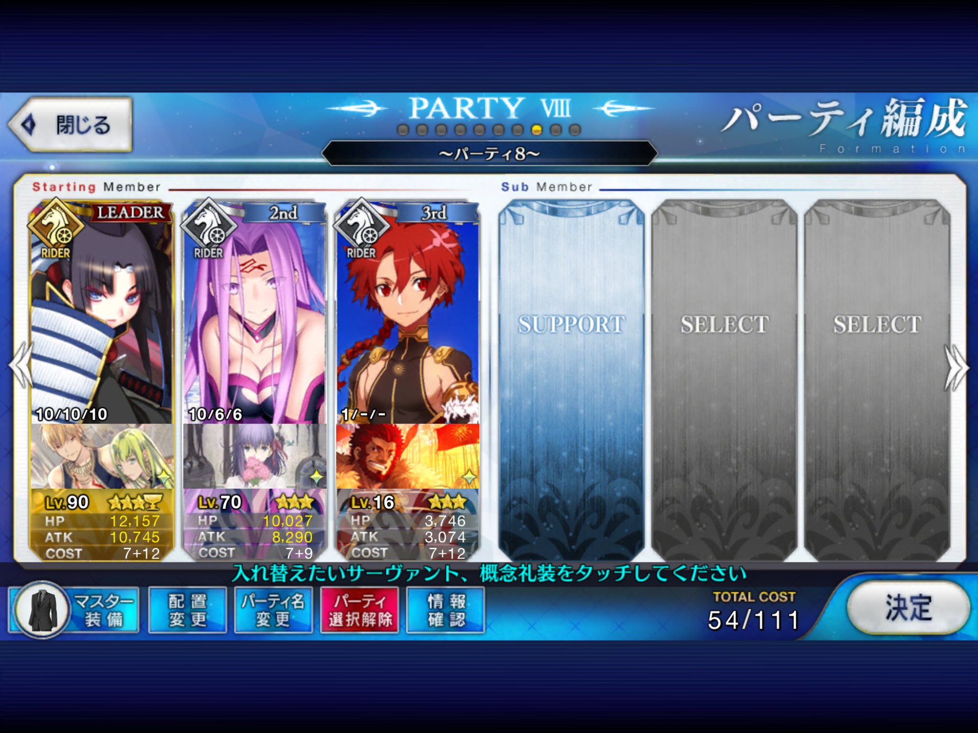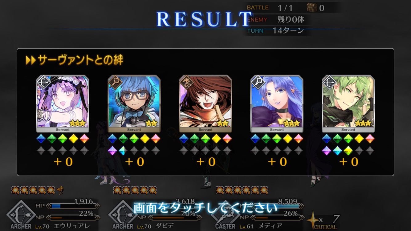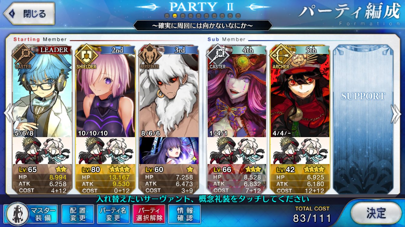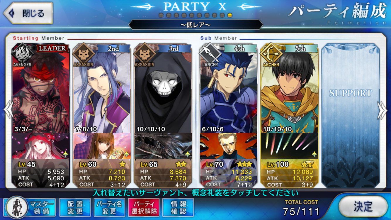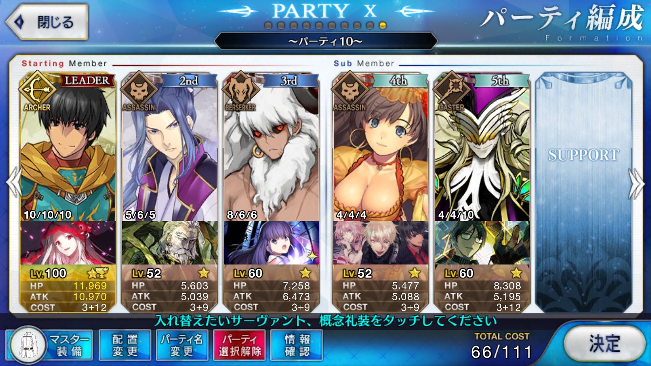 先頭で確定。これでハードルかなり高いがやろうと思えば宝具3連打、実質ステラ三連打が可能ということが判明したレベル1陳宮に凸龍脈持たせて、陳宮自身にスケゴ張って、左端に置いたスカディか孔明でNPチャージして宝具打てば手軽に単騎が作れるな