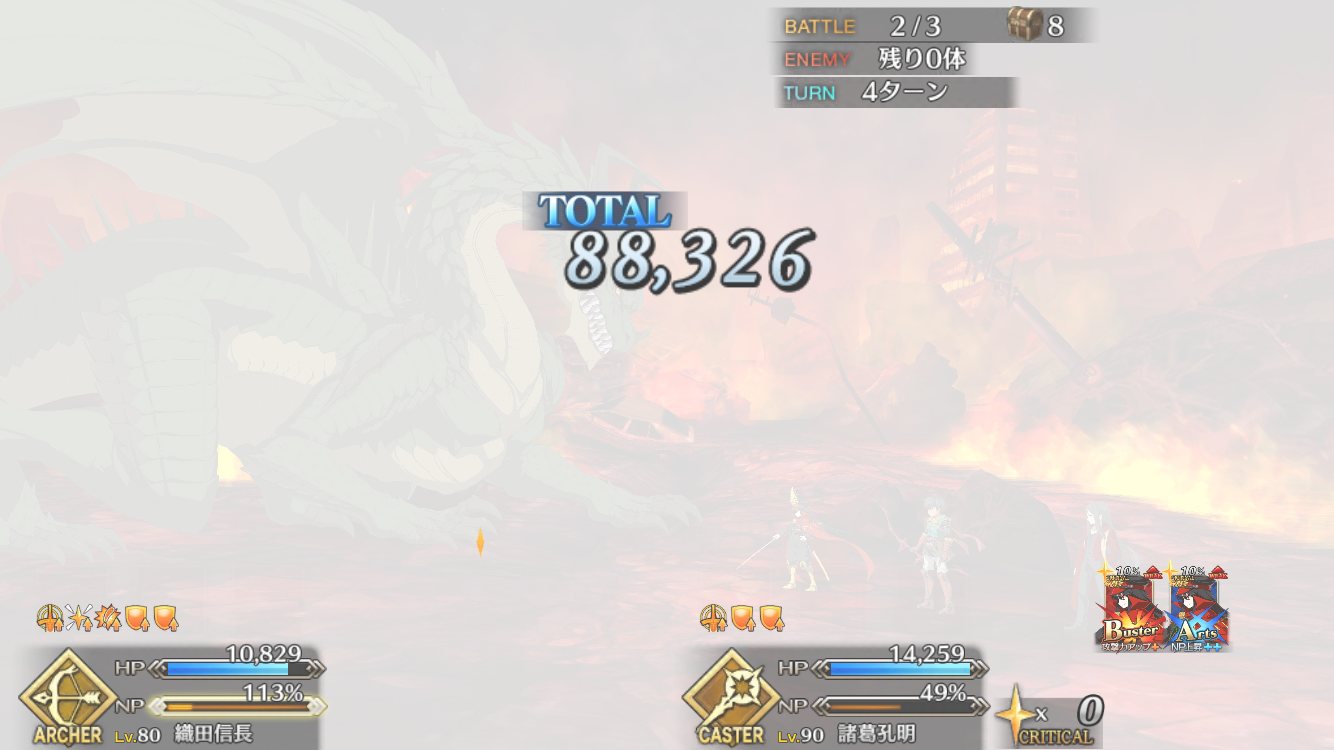 宝具レベル上げて9回バフもれれば、60万くらいは見えるかな