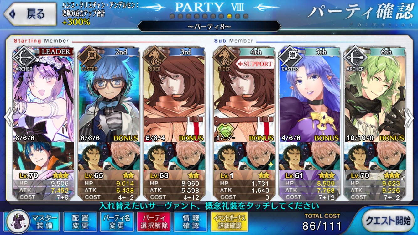 Q強化&攻撃力強化&人型魅了で味方のサポートばっちり、強化済み宝具で宝具火力も十分、Qチェインを重ねればそれだけで星25個確定だ。